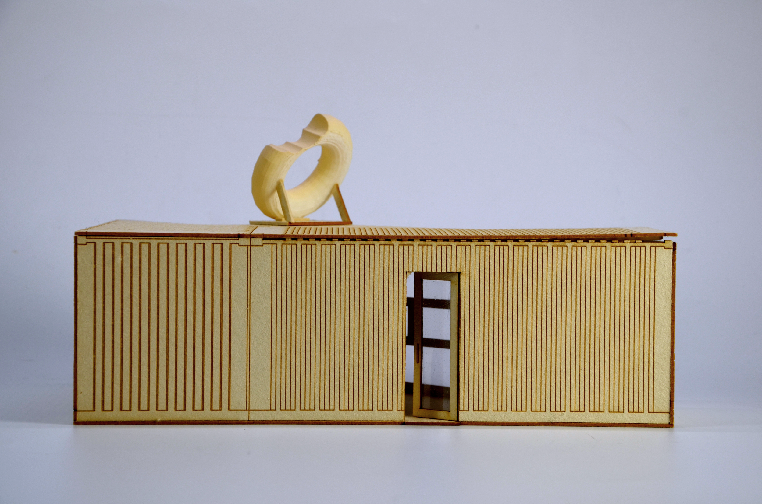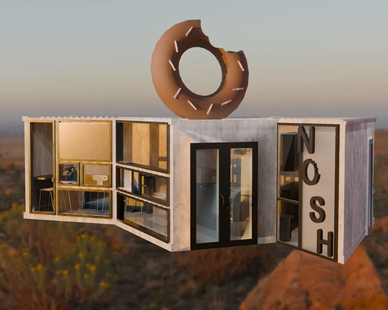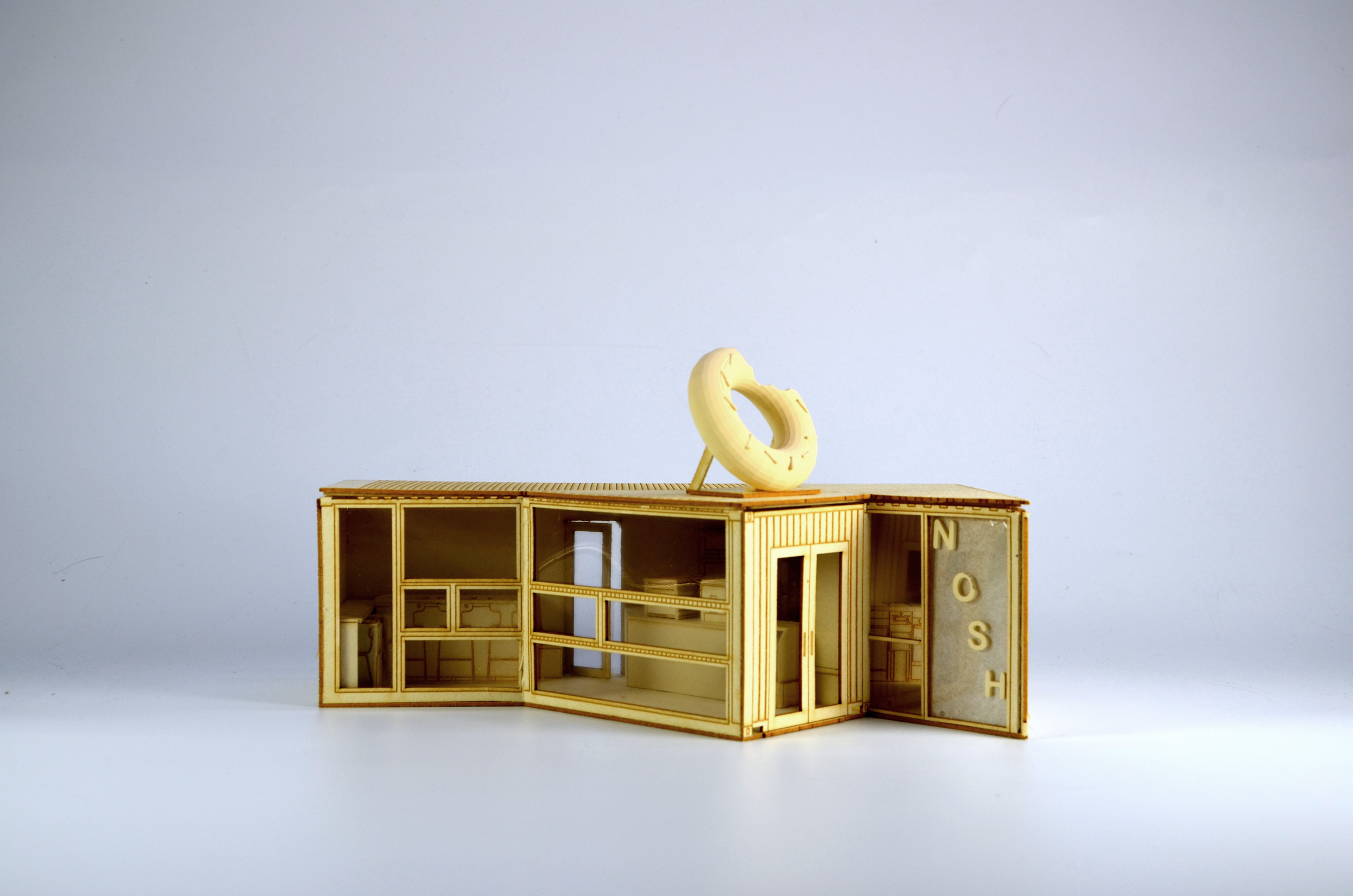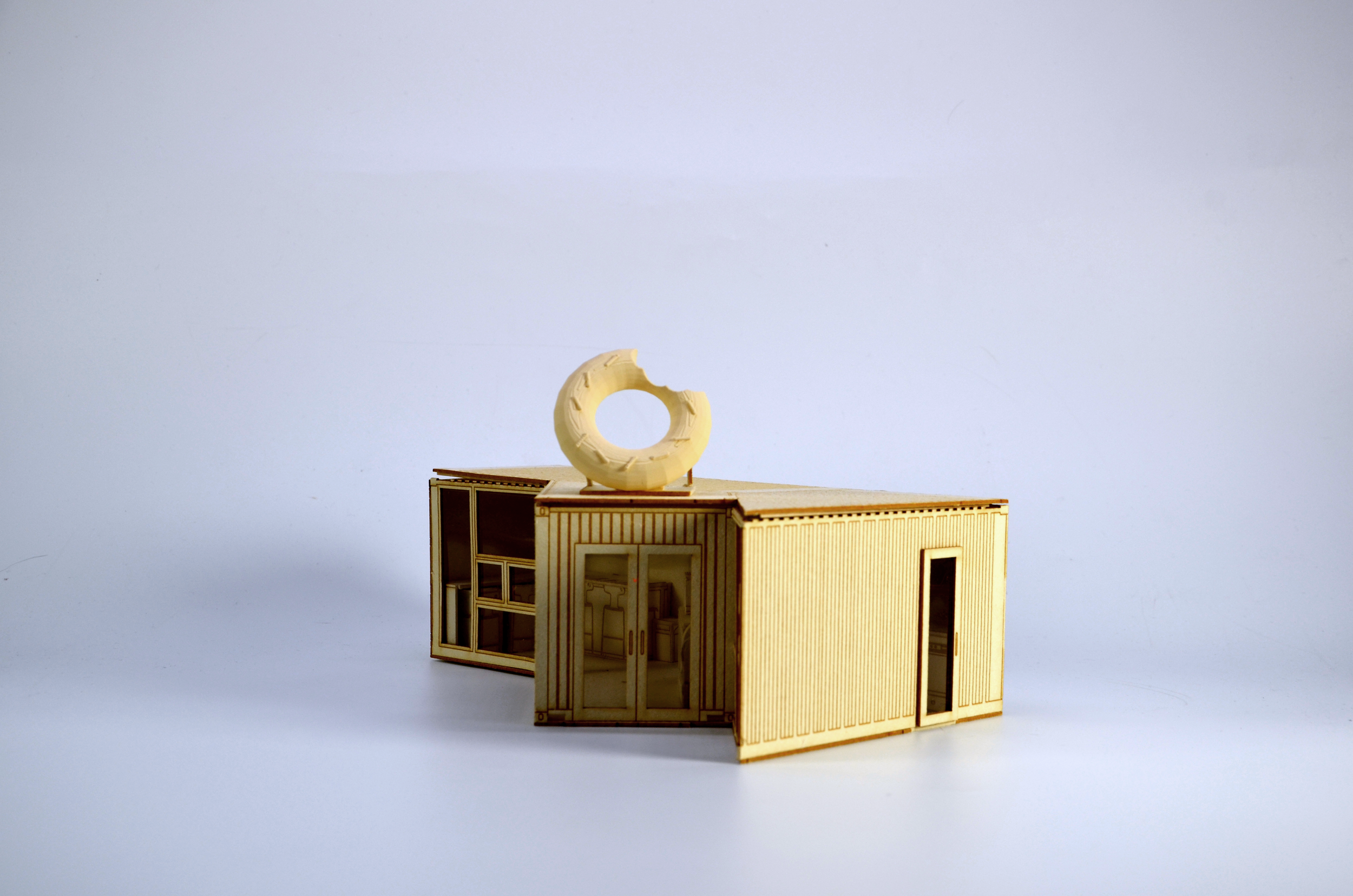 Objective: Design the layout of a donut shop formed by intersecting two shipping containers. Create a space-efficient massing model in SketchUp, then produce orthographic drawings in Layout using standard drafting conventions, including callouts, sections, and elevations. Conclude with a physical scale model built using laser cutting and transfer techniques.