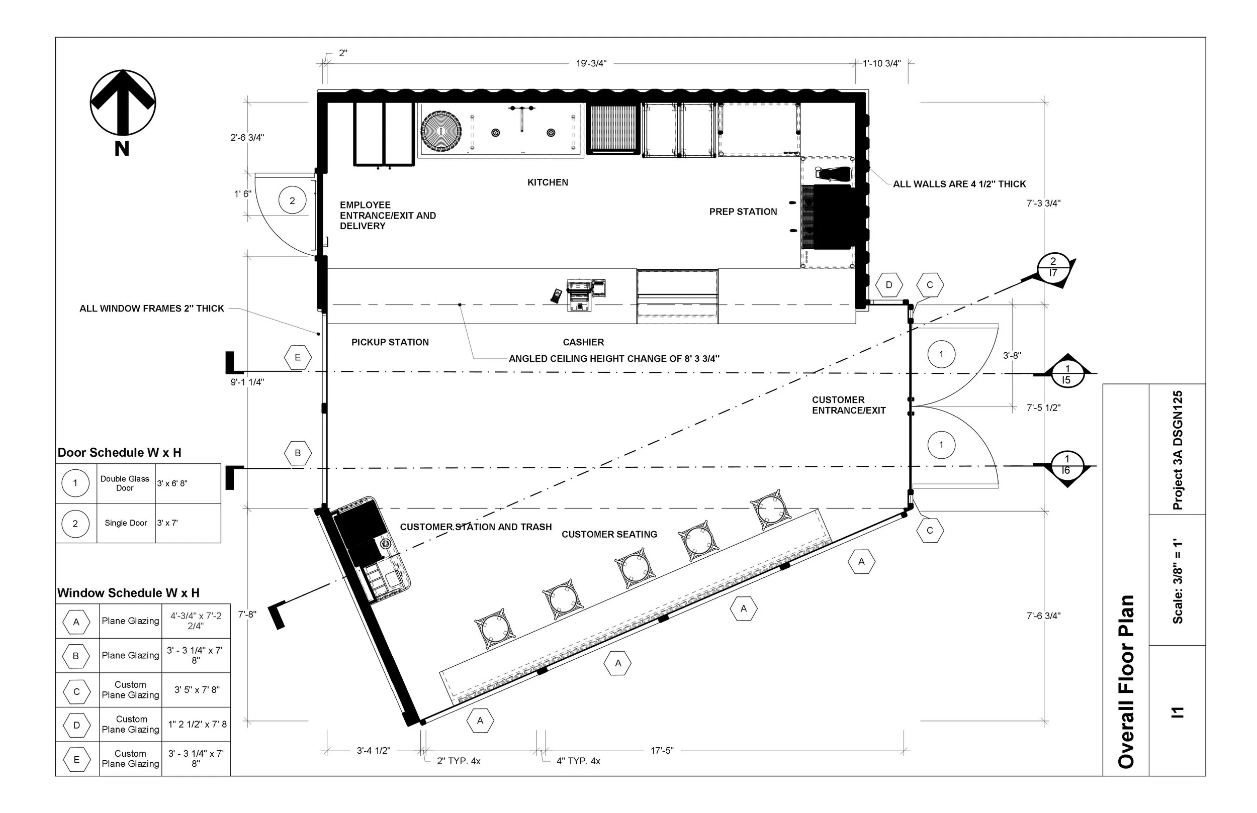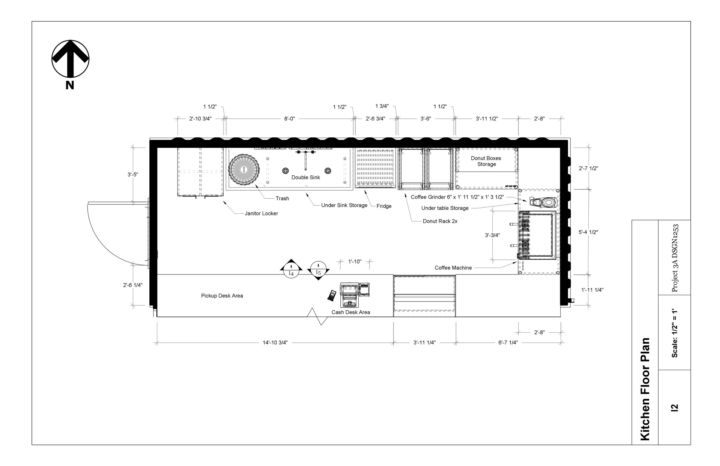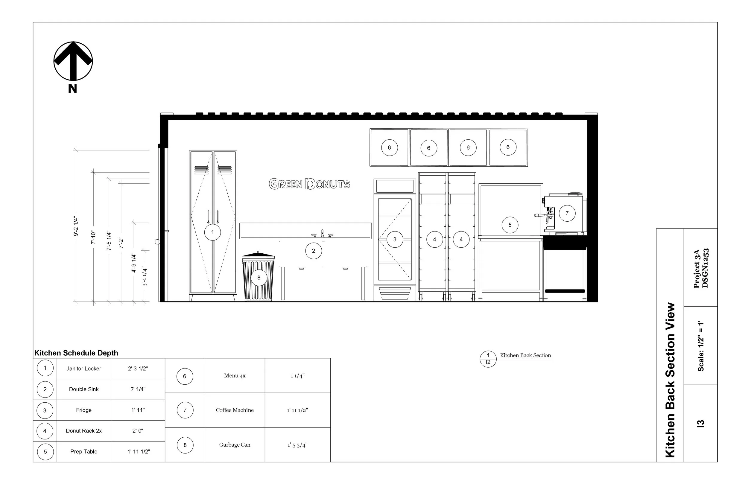 This project explores the design of a donut shop built from two 20 ft shipping containers. The work started with an adjacency matrix and bubble diagrams to understand flow, zoning, and how the space needed to function. This helped with the floor plan, elevations, and sections, which were drafted to meet commercial kitchen guidelines and the limitations of the containers. Each container was allowed one vertical cut, glazing could fill the openings, and no upper level could be used.