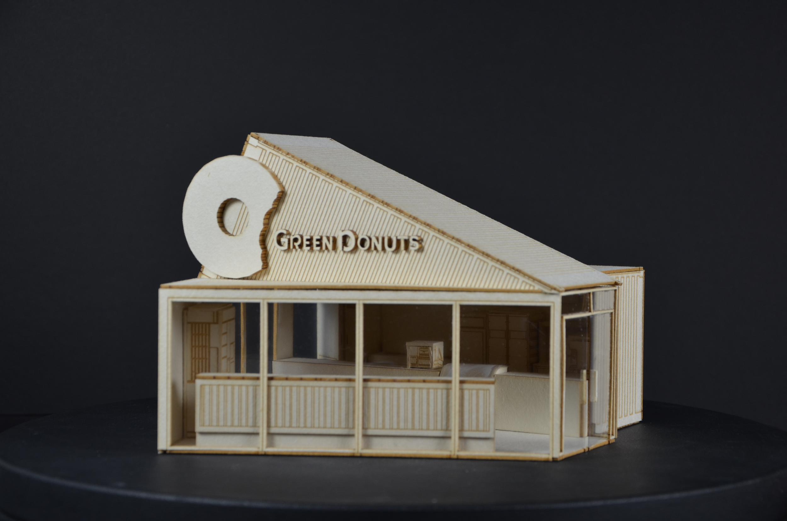 The final stage translated the drawings into a 3/8 inch to 1-foot physical model. Laser‑cut components were used to represent the exterior, interior, and key fixtures. This project later supported the rendering and experiential work completed in Experiential Design IV.