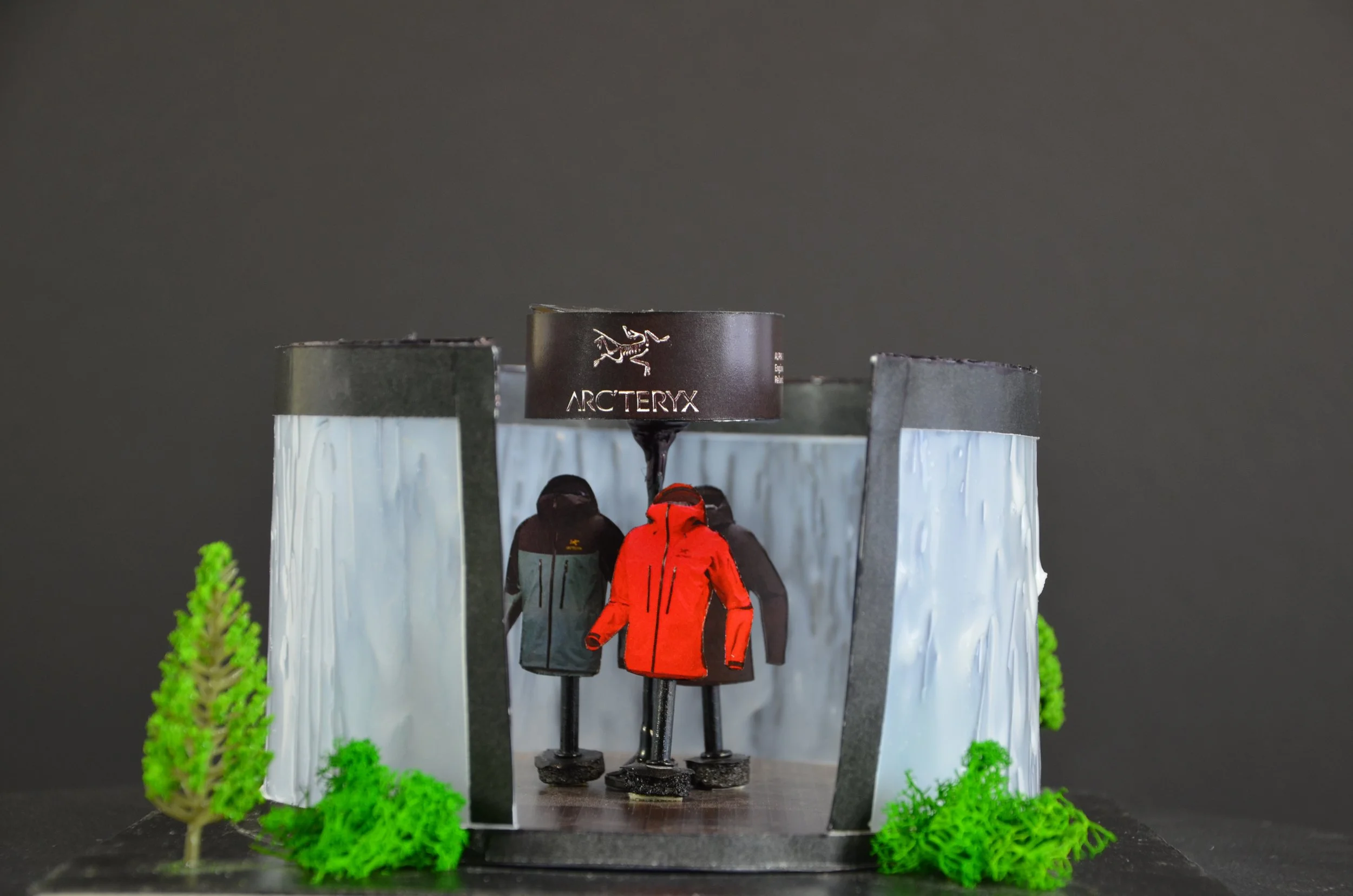 I did an Arc’teryx Alpha SV project for a display model, and my concept focused on one of the jacket’s strongest features, which is waterproofing. This project focuses on creating an immersive exhibit that highlights the Alpha SV jacket, and the concept sits inside a 16’ x 16’ x 16’ boundary. I designed an enclosed circular area with a doorway cutout, and instead of solid walls, I built water walls using tacky glue and acetate to replicate the look and texture of falling water.