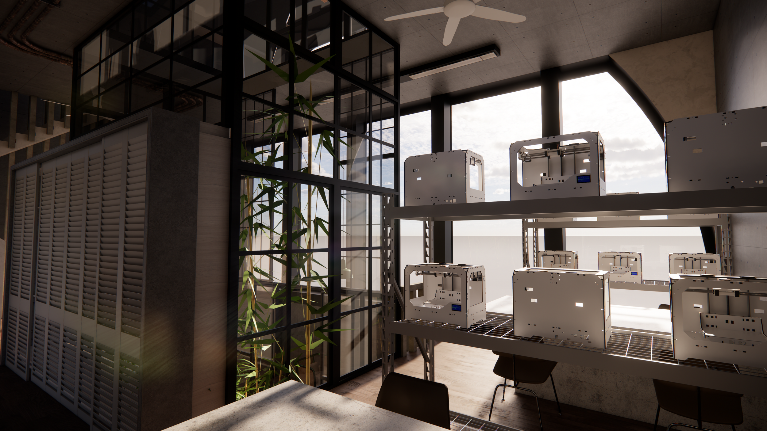 This project started with the idea of having a calm atrium in the middle that everything else wraps around. I didn’t want the workshop and the home to feel like two separate buildings, so the atrium becomes the anchor. It brings in light, has plants, and includes a small tea area, so the space feels quiet and natural.