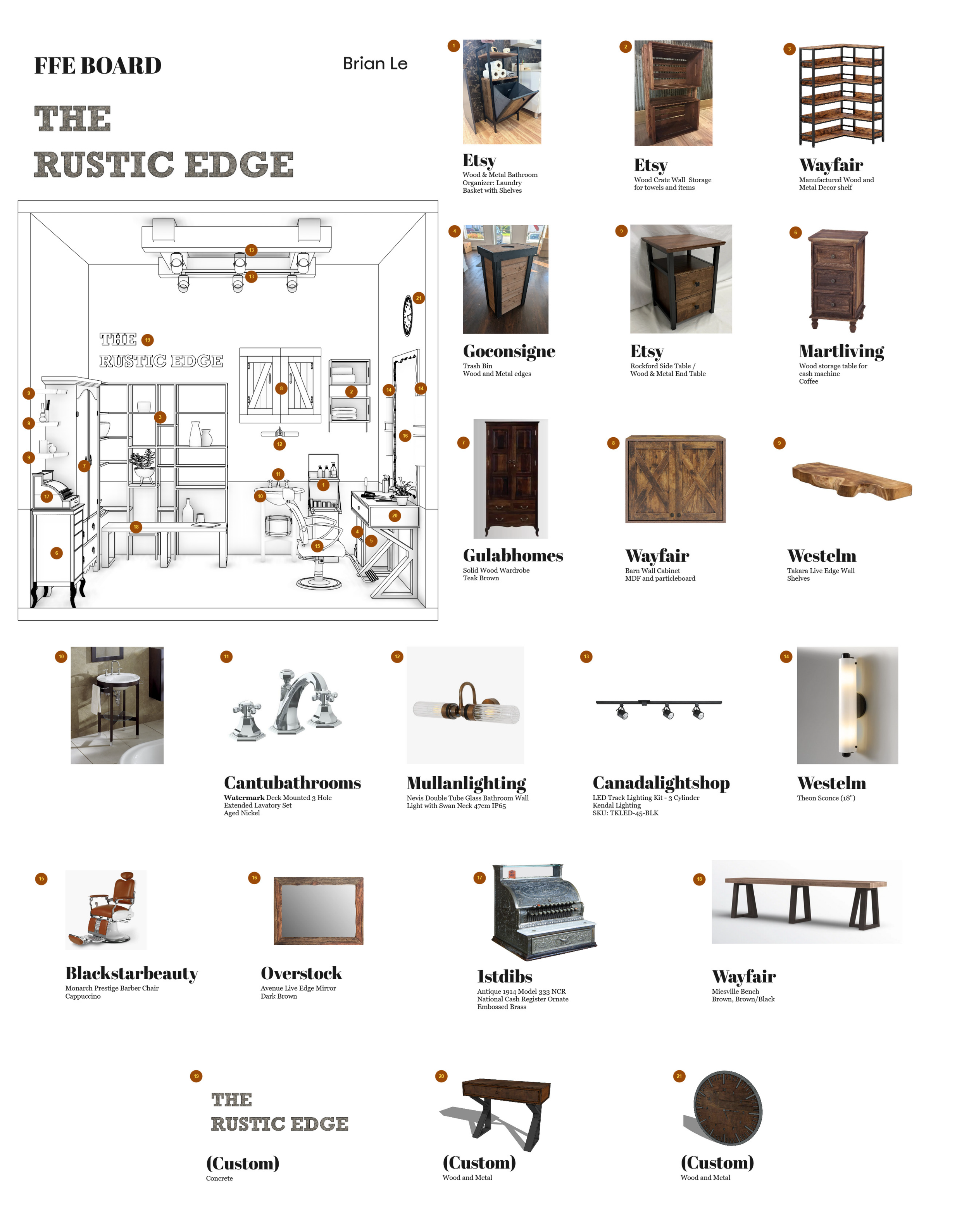 This project focused on designing a small, upscale hair, makeup, and barbershop interior within an 8’ x 12’ footprint. The brief required a complete SketchUp model along with an FFE board and a materials board. I was assigned the Rustic design style, which guided the material palette, atmosphere, and overall direction of the space. My goal was to create an upscale interior using, reclaimed wood, exposed brick, matte black metal, and warm lighting.