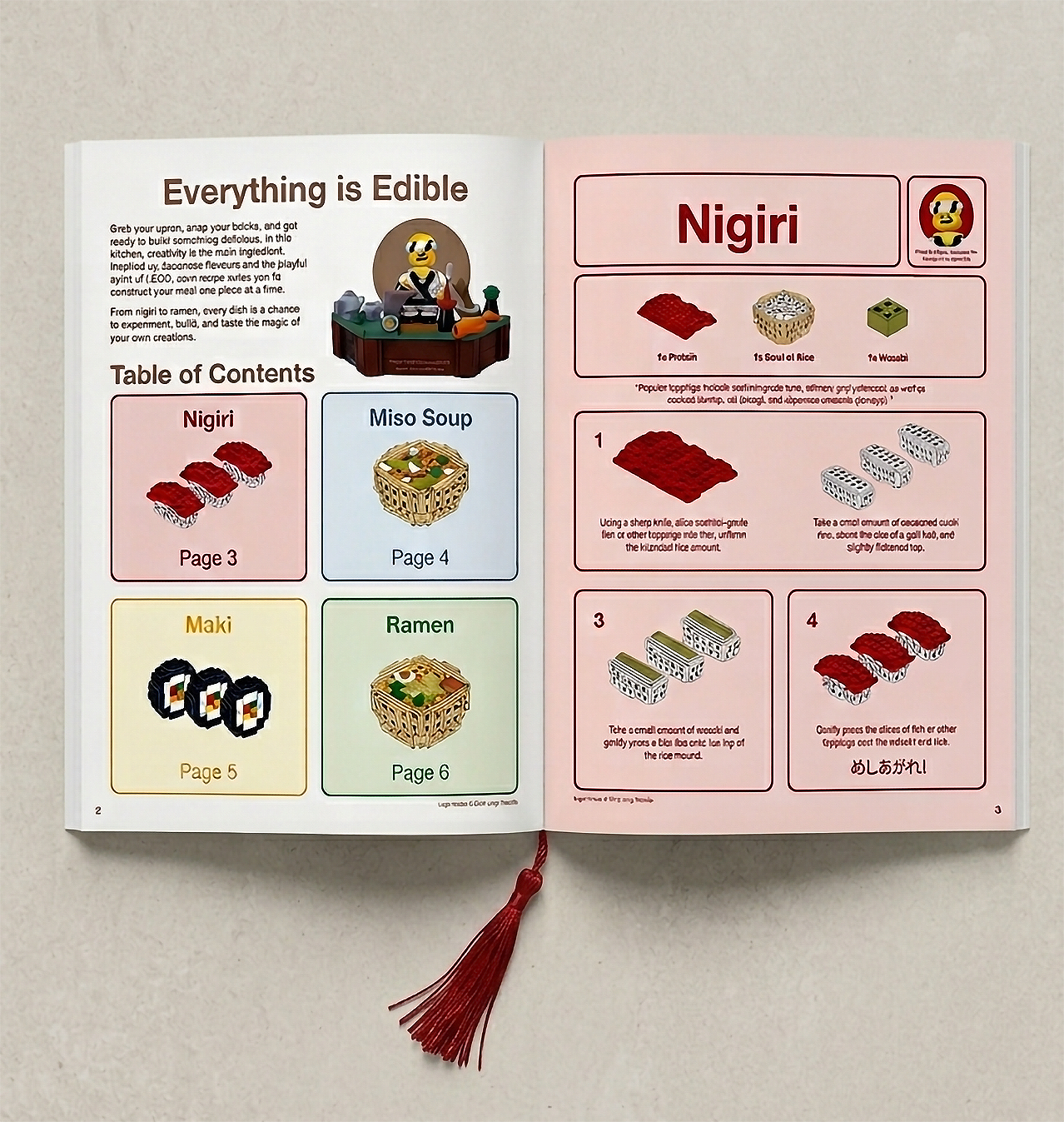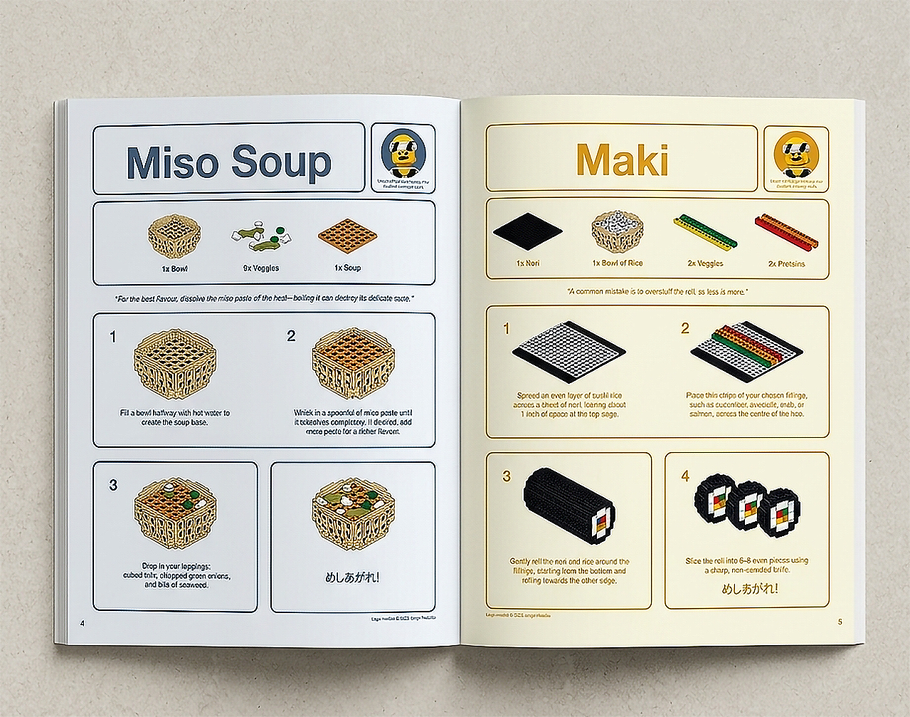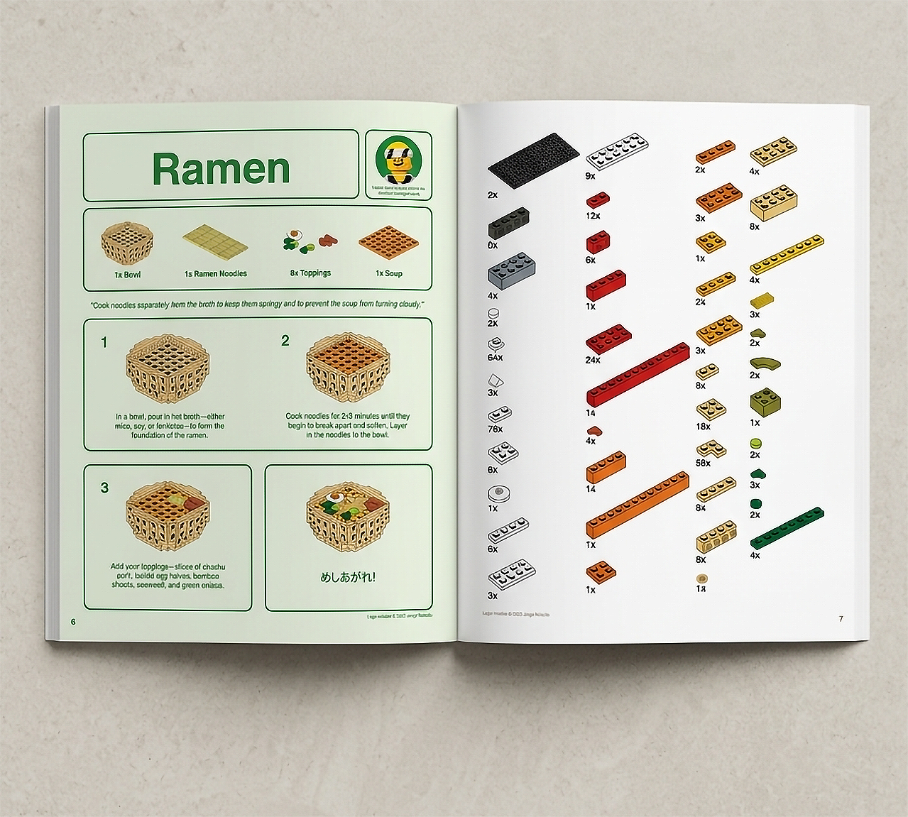 The inspiration for the cookbook comes from the fun construction principle of LEGOs. By this concept, we created a Japanese-themed layout where the LEGOs are used to categorize food items and provide a visual representation of the cooking process.