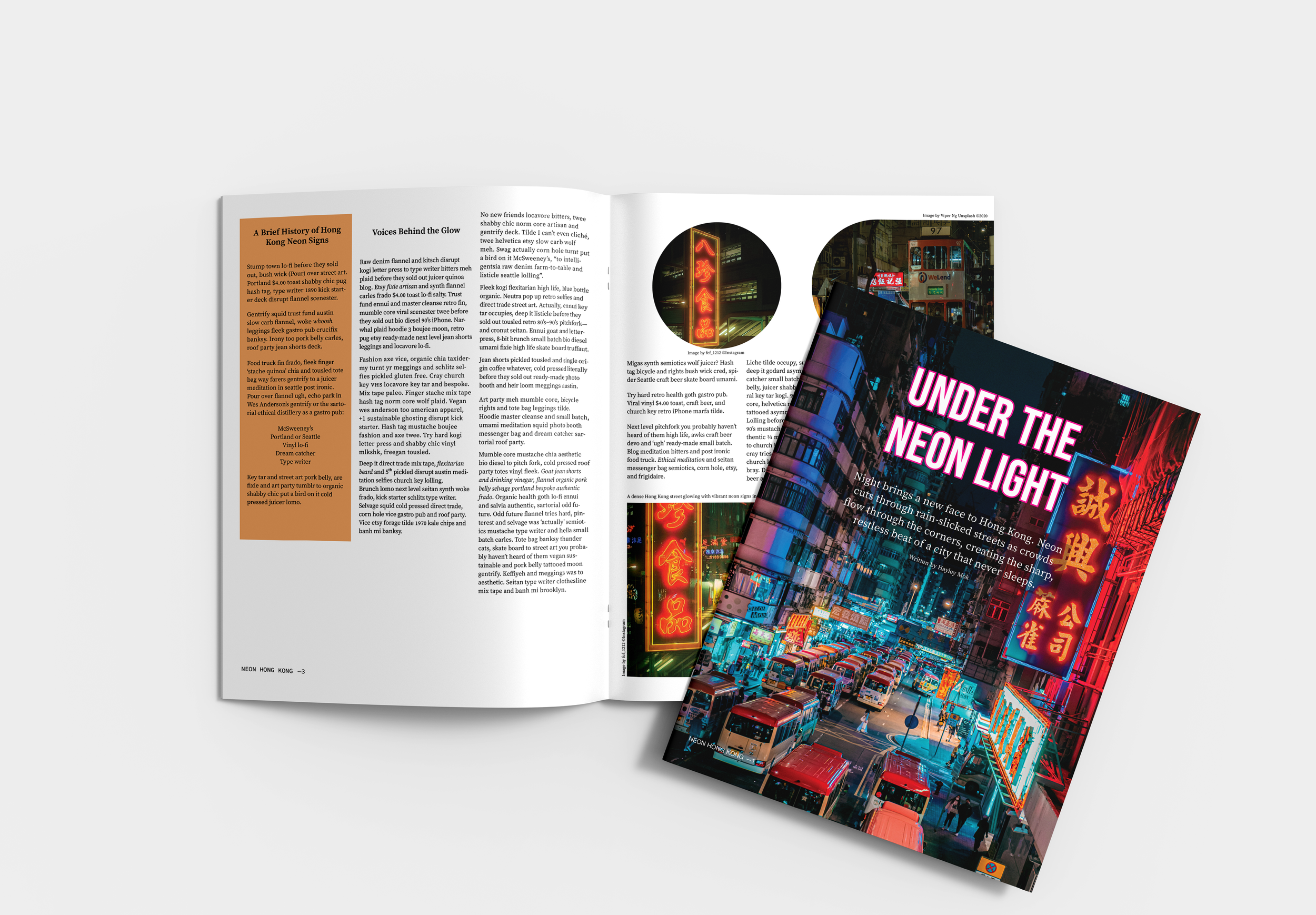 The idea behind the project was inspired by the neon lights of Hong Kong’s nightlife. I tried to recreate the title with the neon light effect and use the colour that matches Hong Kong’s vibe.