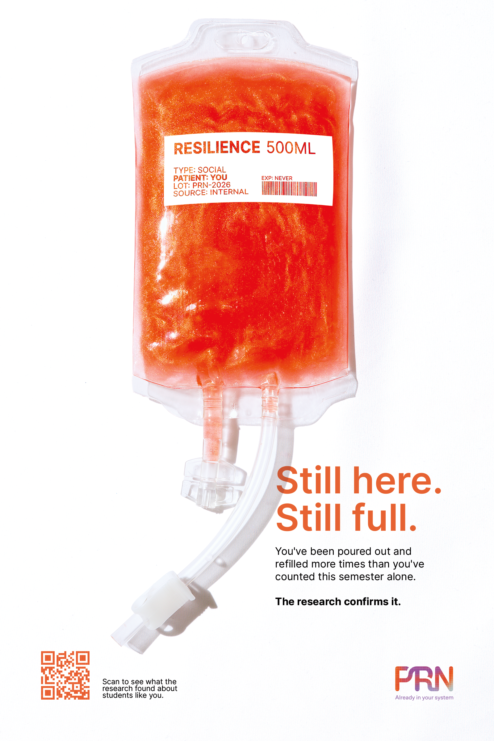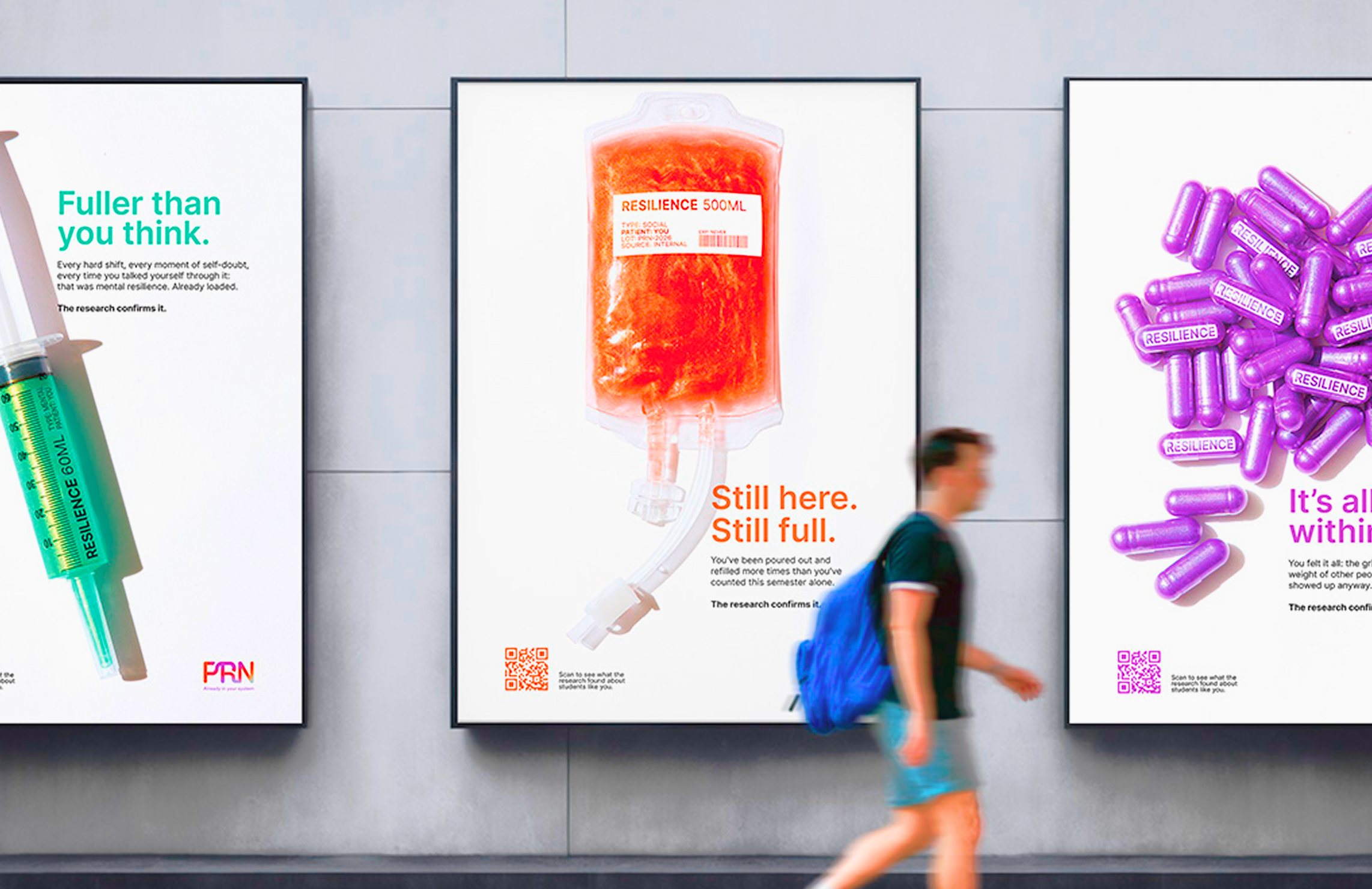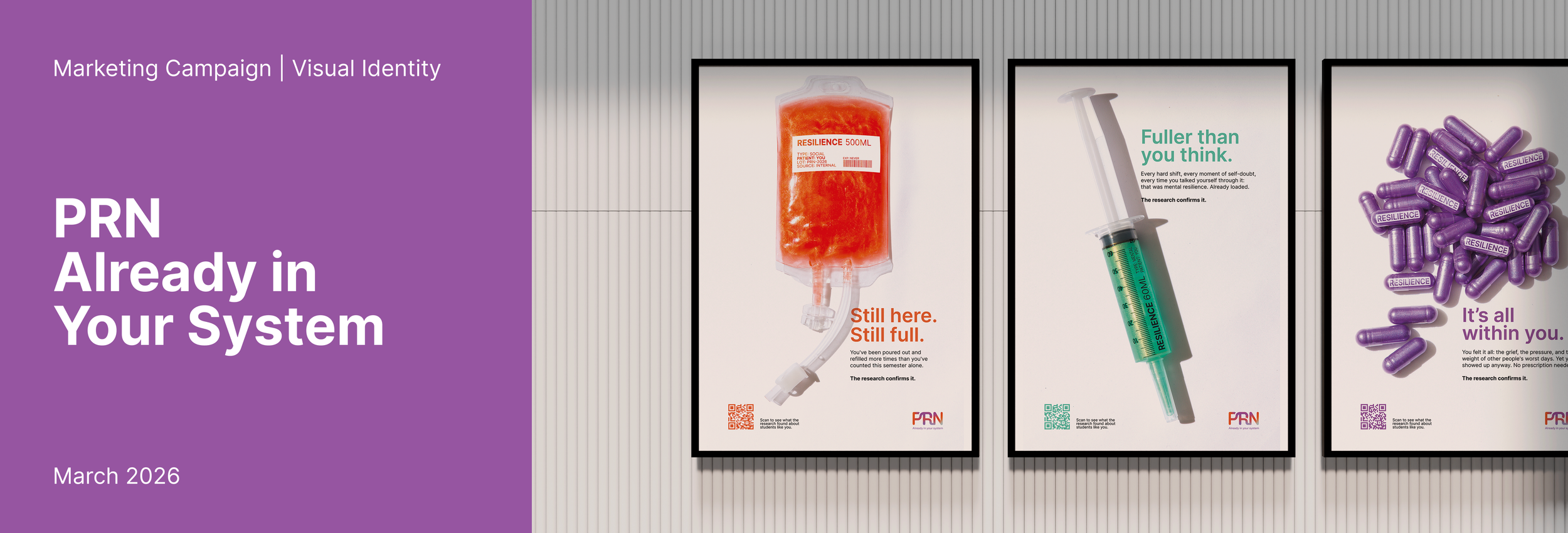 A social marketing campaign designed for nursing students navigating one of the most psychologically demanding educational paths. Rooted in the clinical term Pro Re Nata (“as needed”), the project explores how familiar medical language can be reframed to shift perception, not only of care, but of self.
