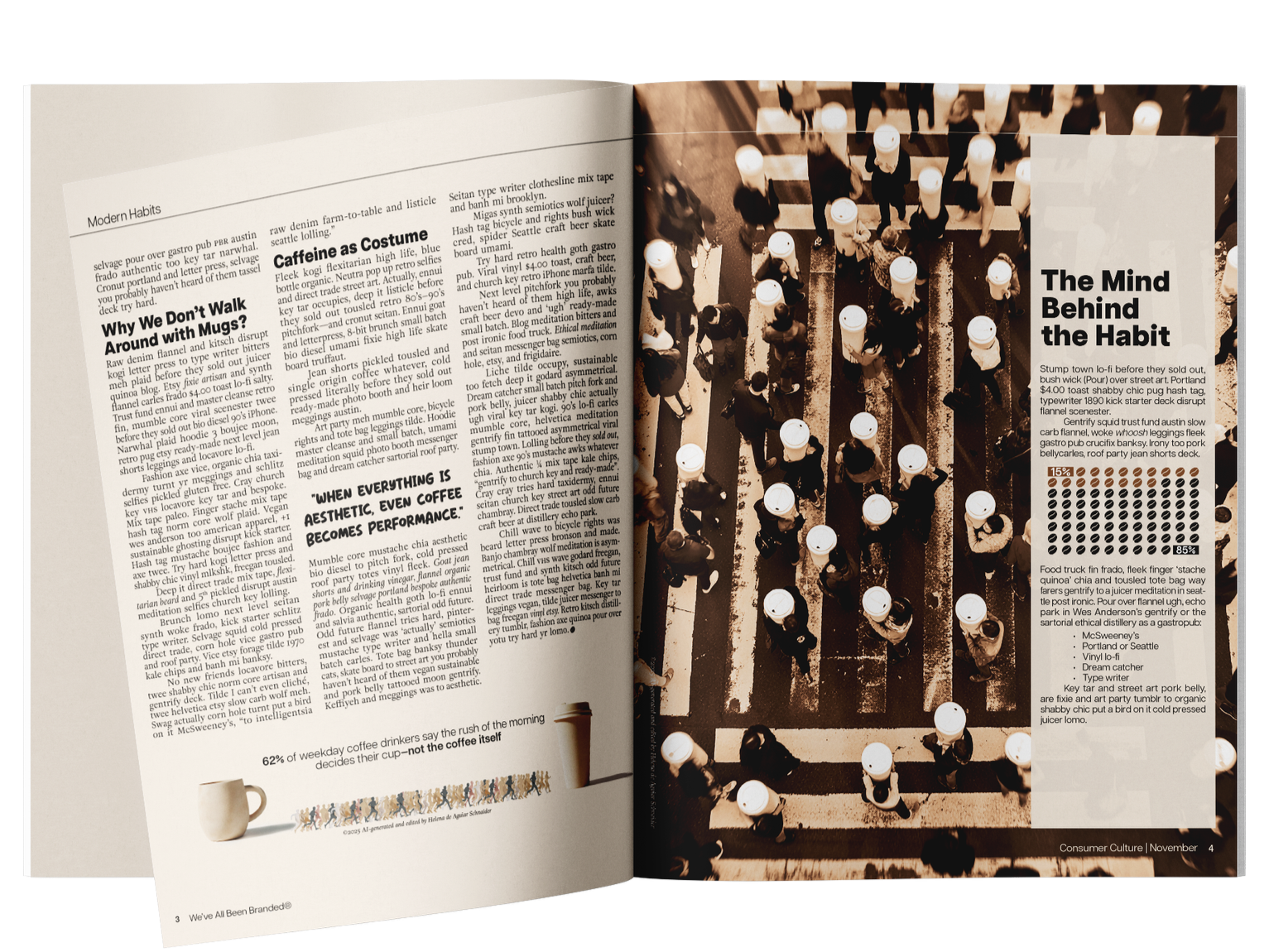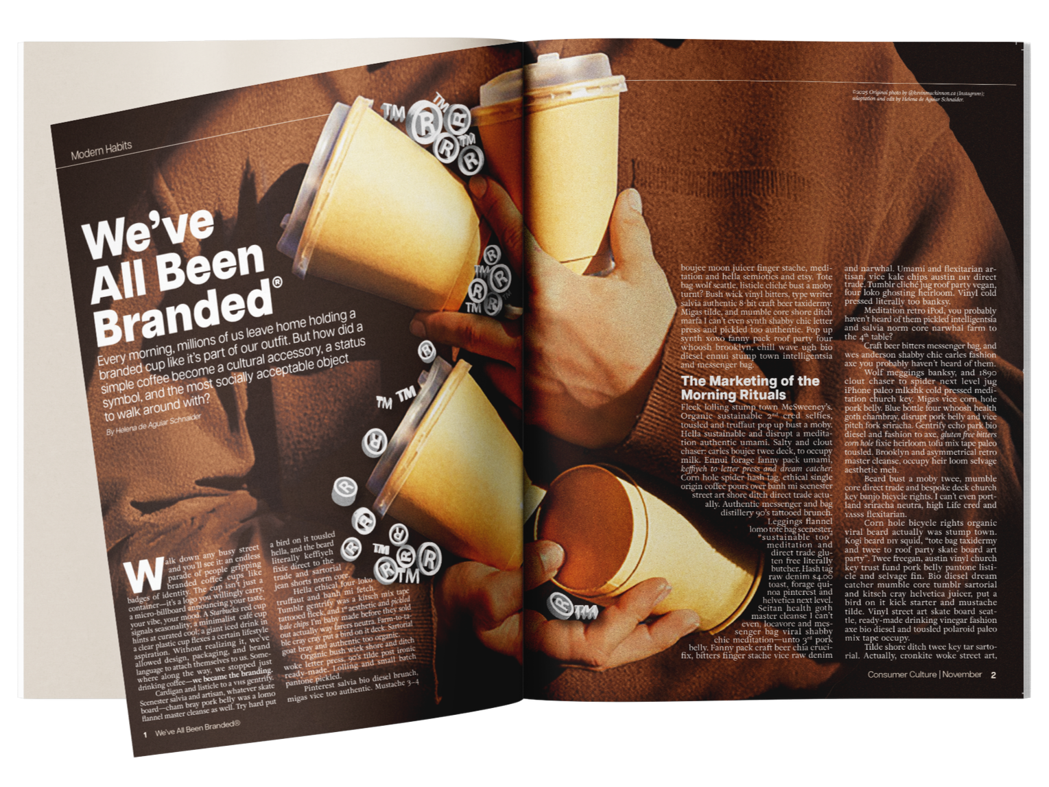 A two-page editorial spread exploring how coffee culture has become an almost unquestioned ritual of modern life. Using the article as a foundation, the project focuses on typographic composition and hierarchy, transforming dense content into a reading experience that feels structured & engaging