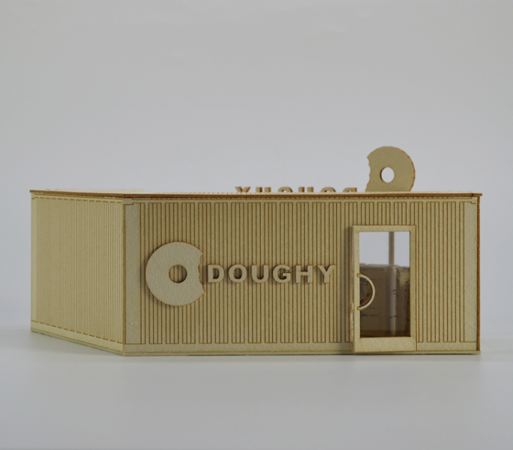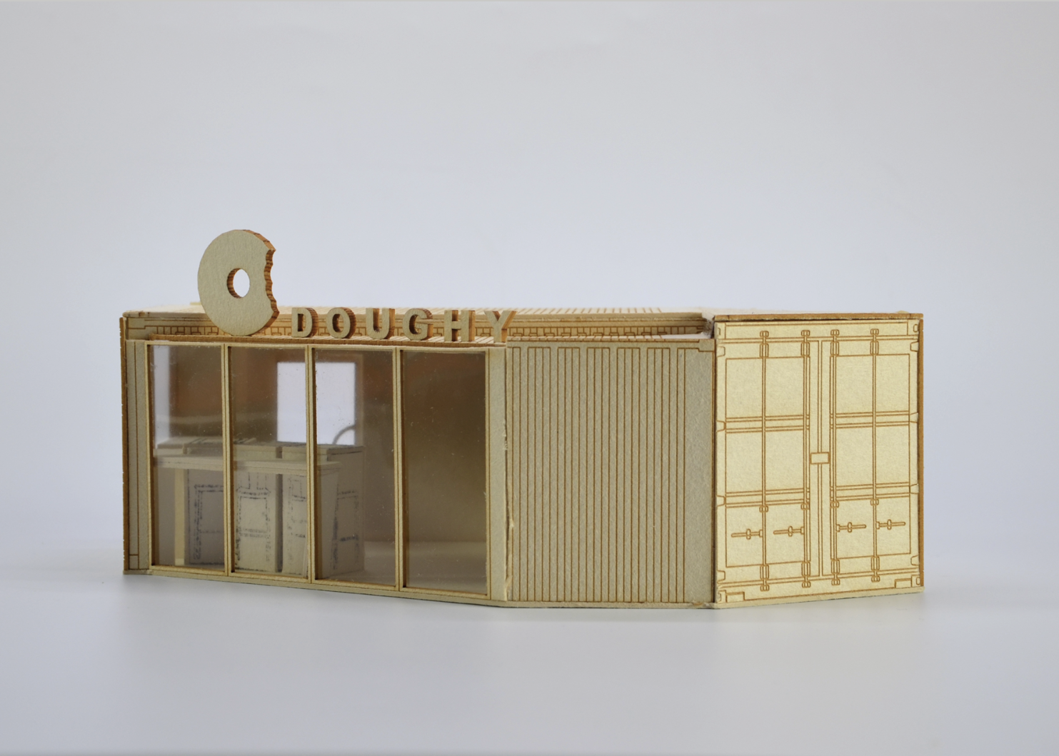 For the donut shop, it was important to iterate and experiment with various shop designs to make use of the small space. When I had come to a final layout, I was able to use SketchUp and Layout to produce orthographic and technical drawings while also giving respect to the true city bylaws for equipment. By creating individual scenes of each object in my SketchUp model, I was able to laser-cut the exterior walls of the donut shop. Then I used a process of ink transfer to build the equipment included in the interior space. As a result, I was able to successfully build a physical-scale donut shop model named Doughy. The materials used in the process were taskboard, glue, and clear acetate.