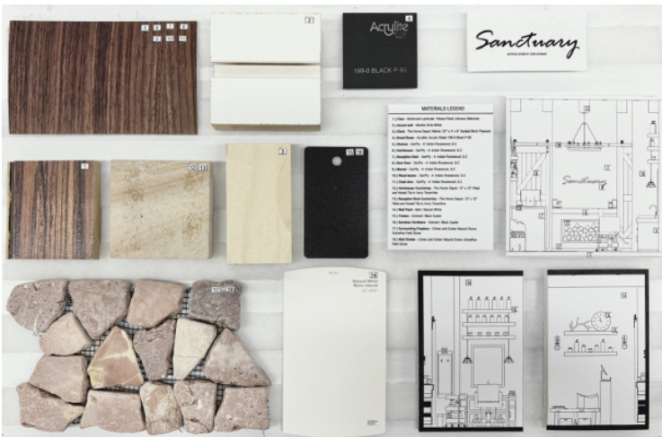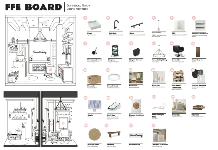 I had been tasked with a rustic design style. After researching this style and creating layout diagrams, I iterated designs in SketchUp and assessed spatial relationships between elements. Feedback shaped the final branded salon, using materials to enhance a rustic feel. The completed project included a furniture, fixtures, and equipment (FFE) board and a material board, illustrating selected materials and furnishings as part of the spa’s finished interior.