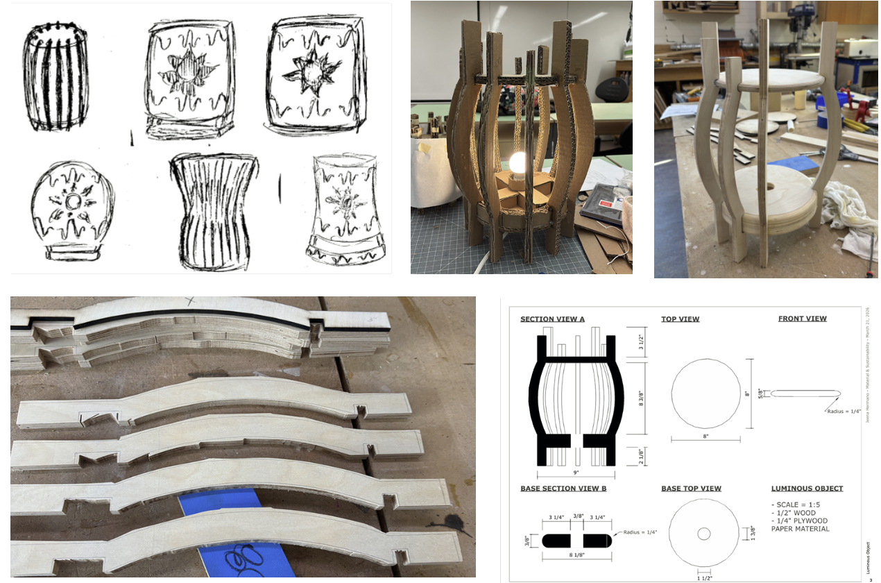 For my luminous object, I drew inspiration from the “floating lights” in the Disney movie Tangled. Experimenting with different forms and elements of the lamp through hand sketches and scaled cardboard mockups allowed me to receive constructive feedback and helped me envision the outcome. Once I decided on a design, I replicated my lamp in SketchUp and Layout to generate orthographic views and measurements, then began fabrication. I worked closely with an experienced carpenter to build the lamp. The materials used in this process included different thicknesses of plywood, a variety of tools, glue, and the supplied light and cord.