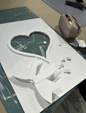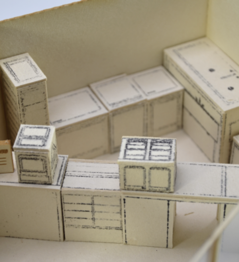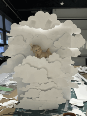The mystery item I had received was a vintage porcelain Kewpie doll, modelled after Rose O’Neill’s Kewpie illustrations. After doing thorough research on my assigned object, I began hand-sketching and iterating ideas while combining attention-getting devices such as nostalgia, scale, and repetition. Using these devices helped me refine my design choices to create and display an experience that best suited the doll. The design as a whole had been hand-cut by me using an Exacto knife and scissors. The materials I used in my extraordinary model were several pieces of bluejay paper, foamcore, tape, glue, and wooden cubes.