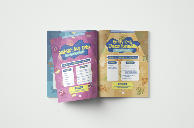 My group and I chose to create a child-friendly cookbook. Reflecting on our childhoods, an important cartoon character for us growing up was SpongeBob SquarePants. Therefore, we created a SpongeBob SquarePants-themed cookbook with easy-to-follow recipes for children to make before bedtime. As a group, we used Illustrator for the graphics and experimented with different typefaces. Our final product is a fun and accessible cookbook for children, featuring engaging visuals and simple instructions that encourage independent cooking before bedtime.