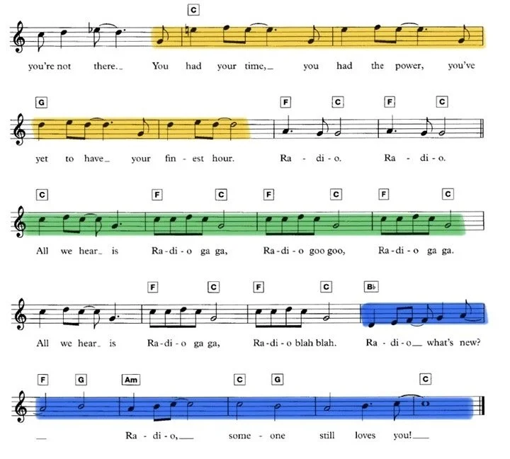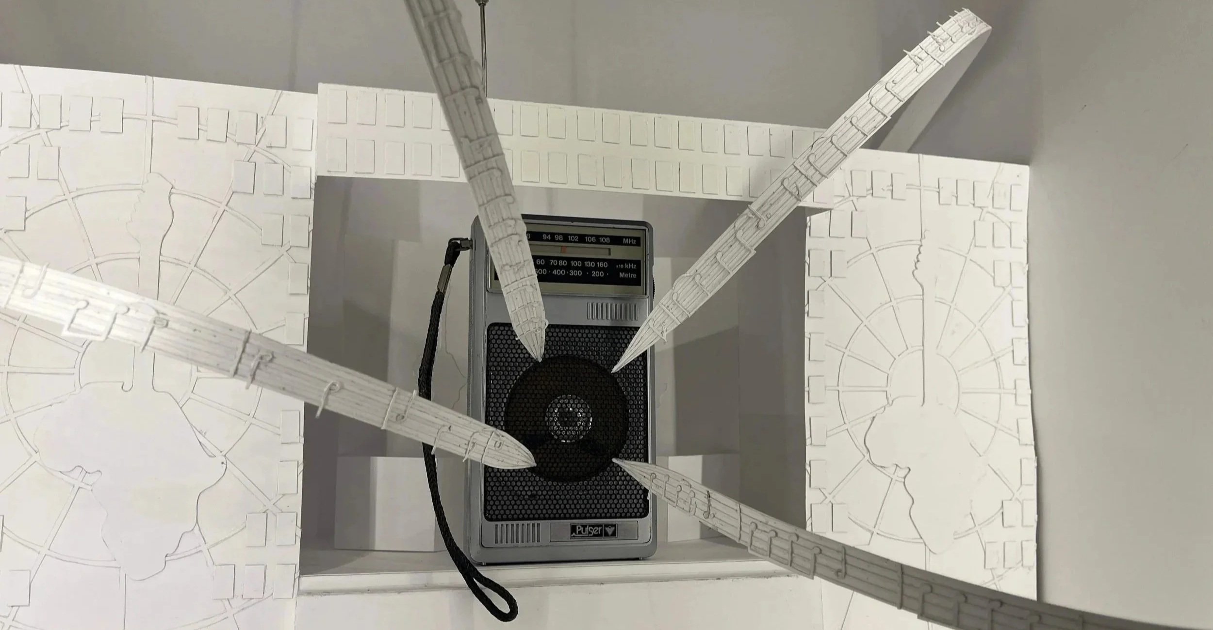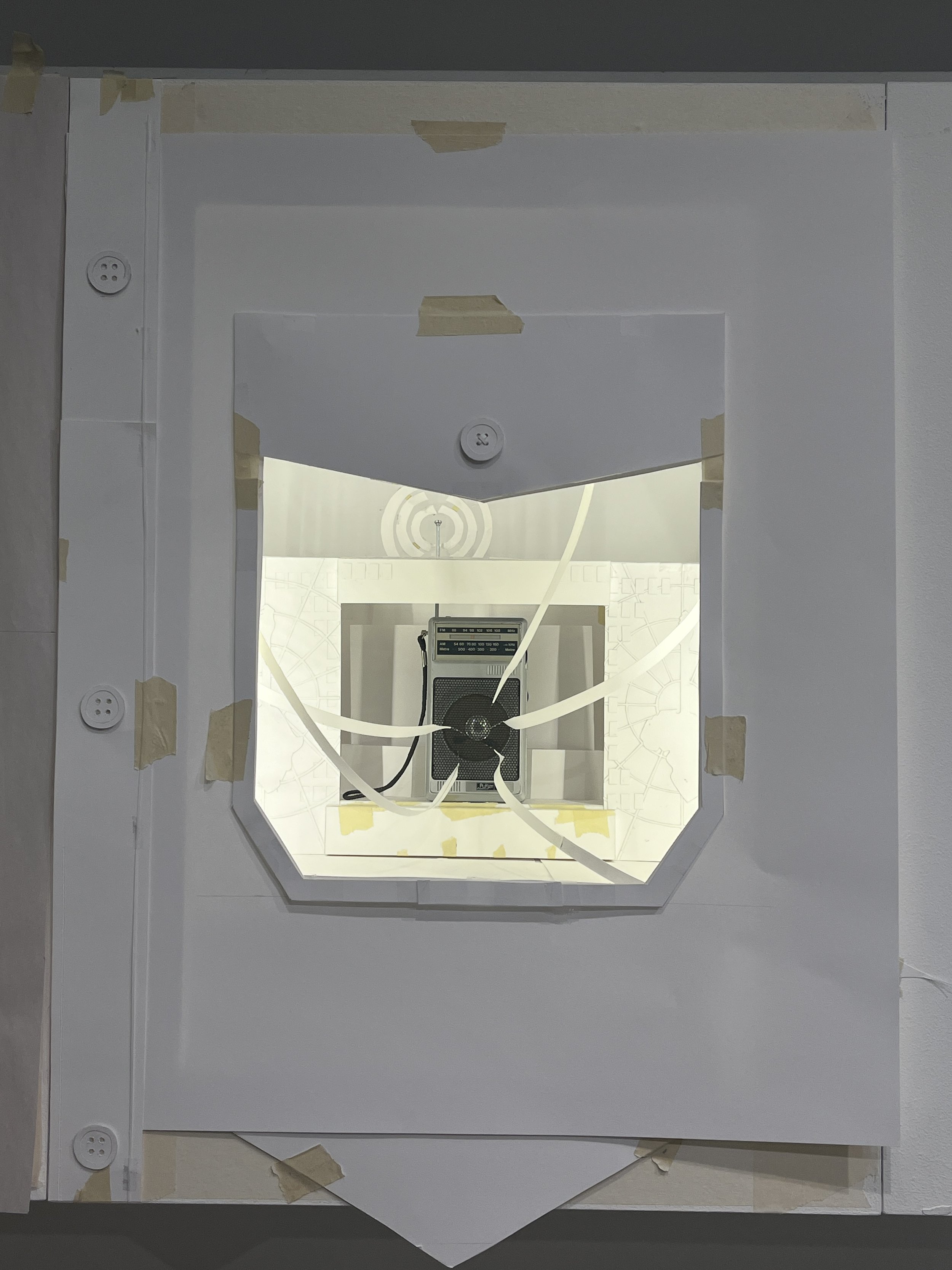 The interior is a miniature recreation of the Live Aid stage. At the centre sits the radio, positioned as the source of sound and energy. Extending outward from the speaker are strips of musical notes, which have some of the lyrics from Radio Ga Ga.