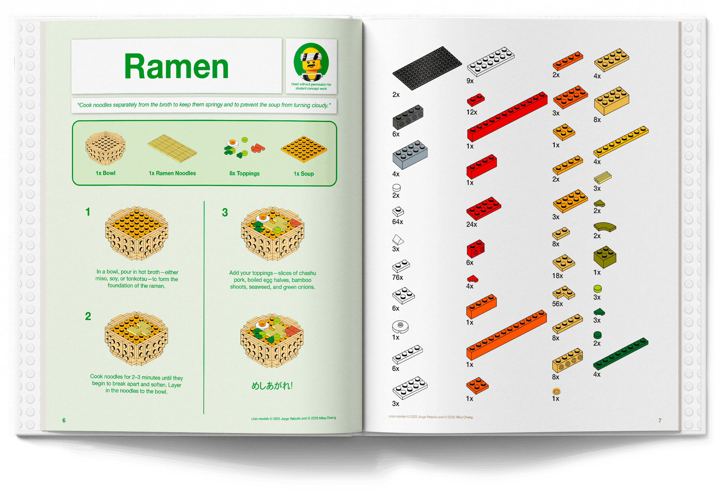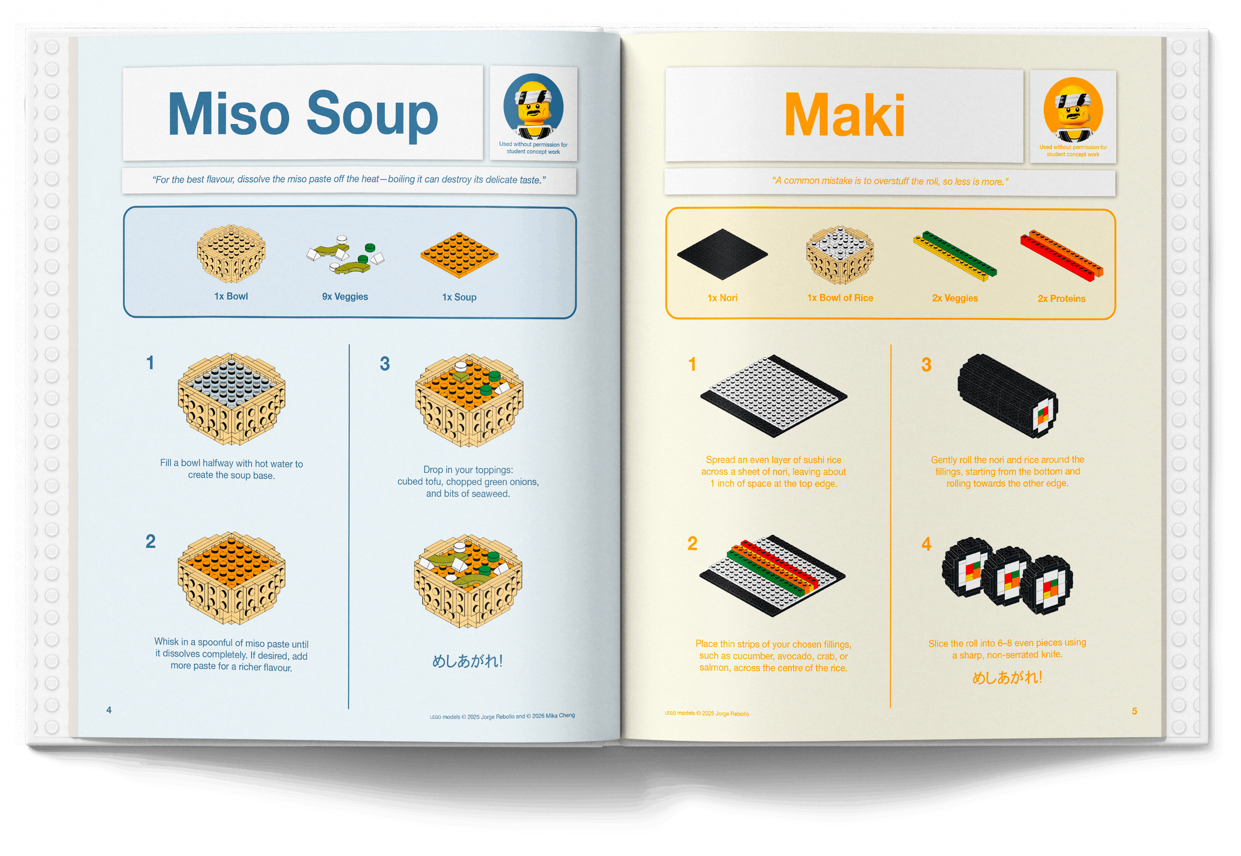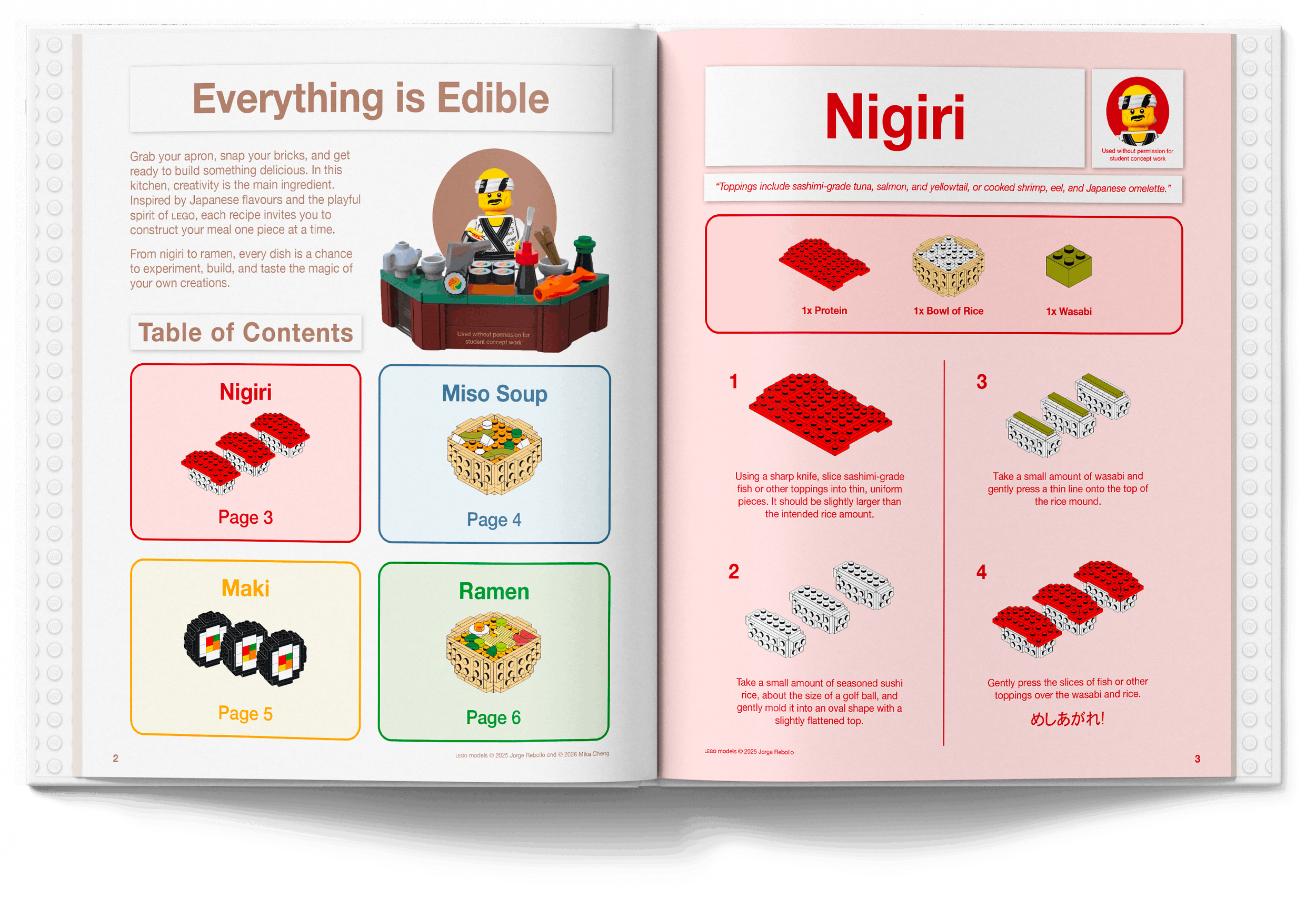 This cookbook was developed as a group project, and we decided on a concept inspired by LEGO instruction manuals.The intention was to use the familiar step-by-step visual language of LEGO building guides into a culinary context, using digestible steps, simplified diagrams, and sequential layouts to communicate each recipe.