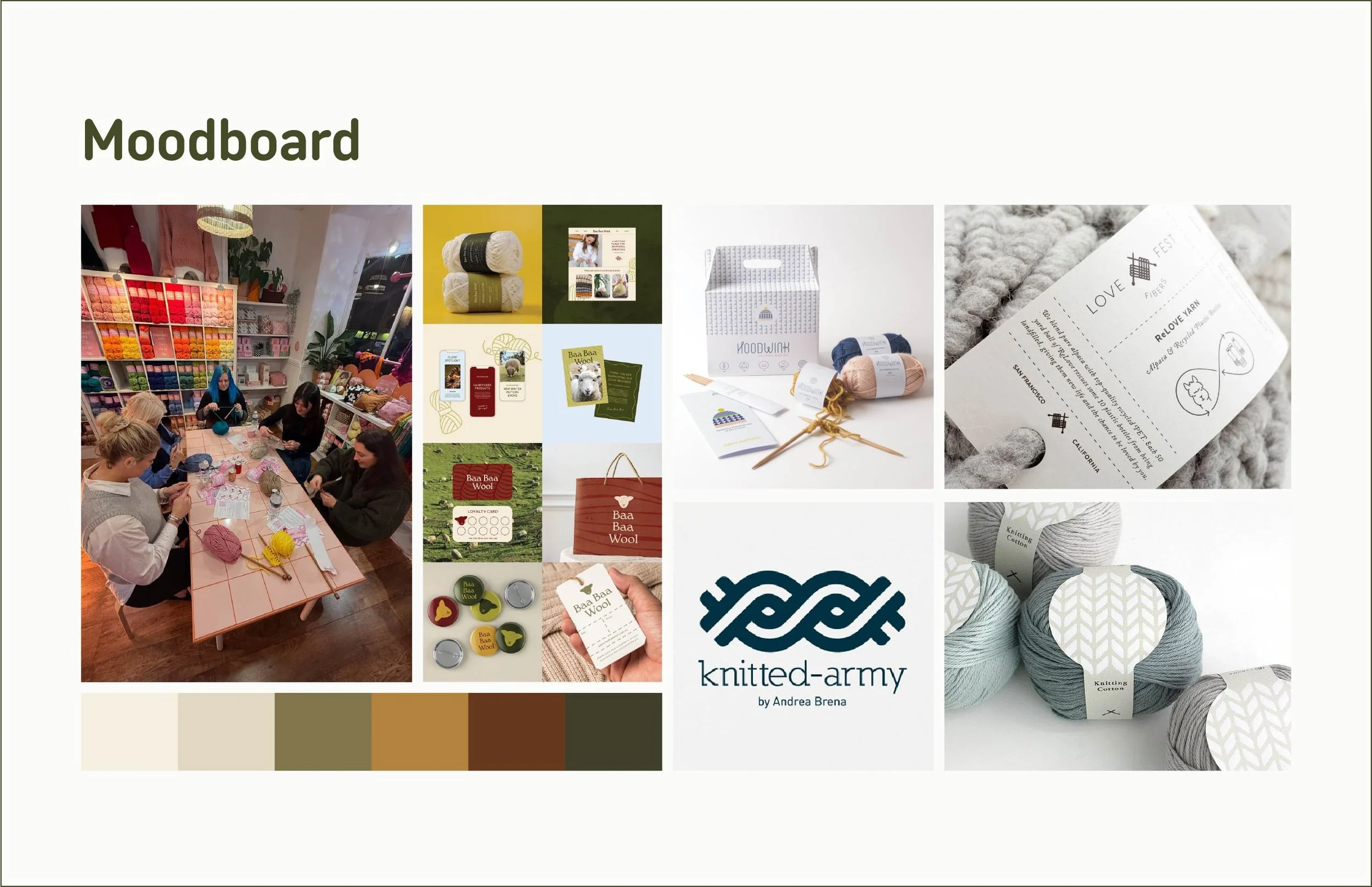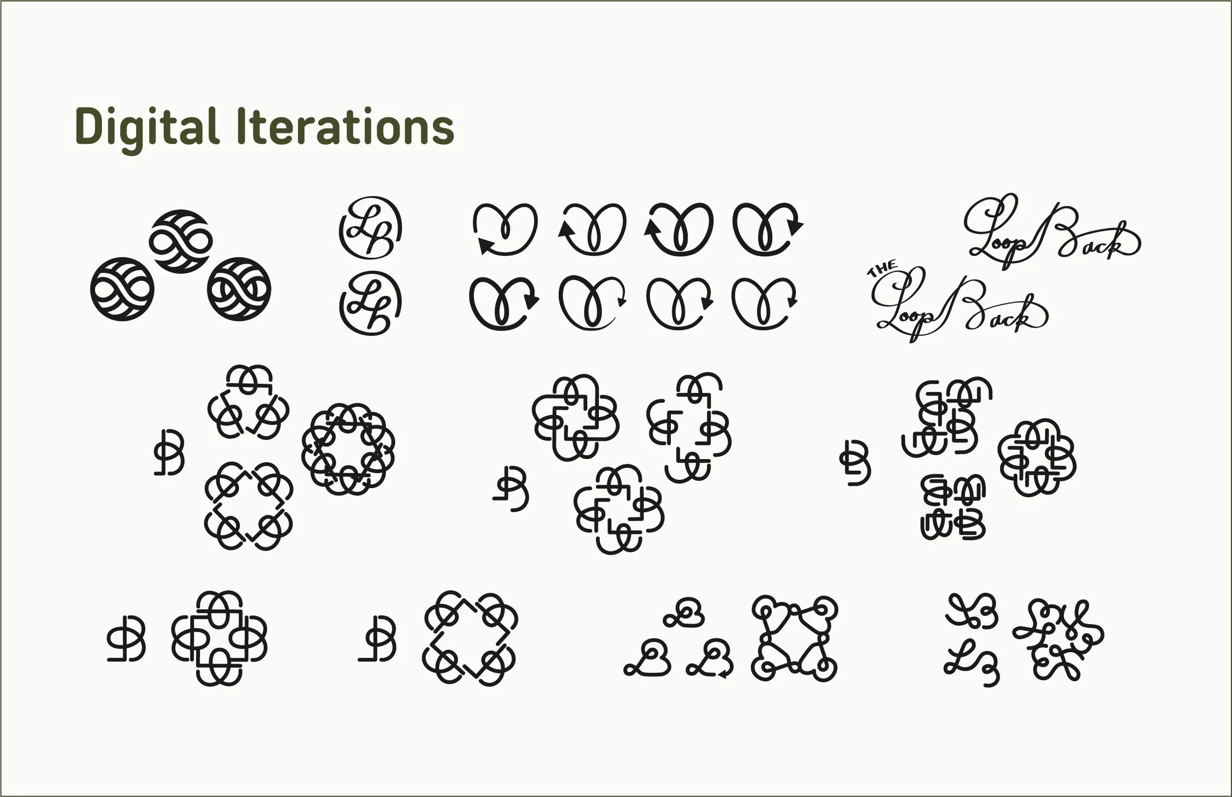 The name “Loopback” comes from the brand’s proposed recycling program, where customers can donate their scraps to be reprocessed into new yarn that is then resold; this idea informed the concept and identity. Granny square patterns were incorporated into the yarn labels as decoration and as a functional element, giving users a simple pattern they can follow or experiment with.