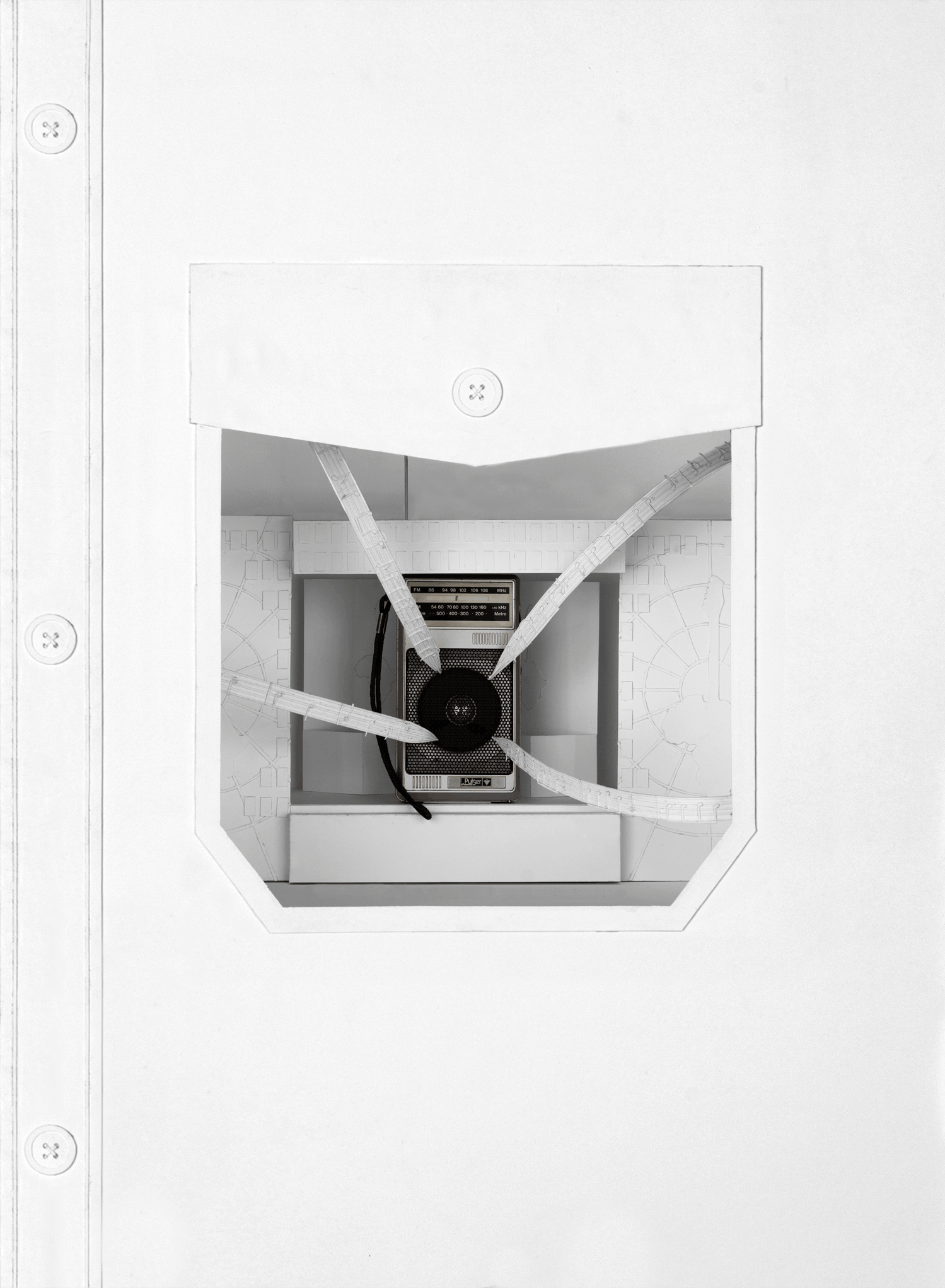 The exterior of the showcase takes the form of a button-up shirt, referencing how pocket radios were originally designed to be small enough to fit inside a shirt pocket. A cutaway opening in the pocket allows viewers to see inside, bridging the everyday function of the object with its larger cultural significance.