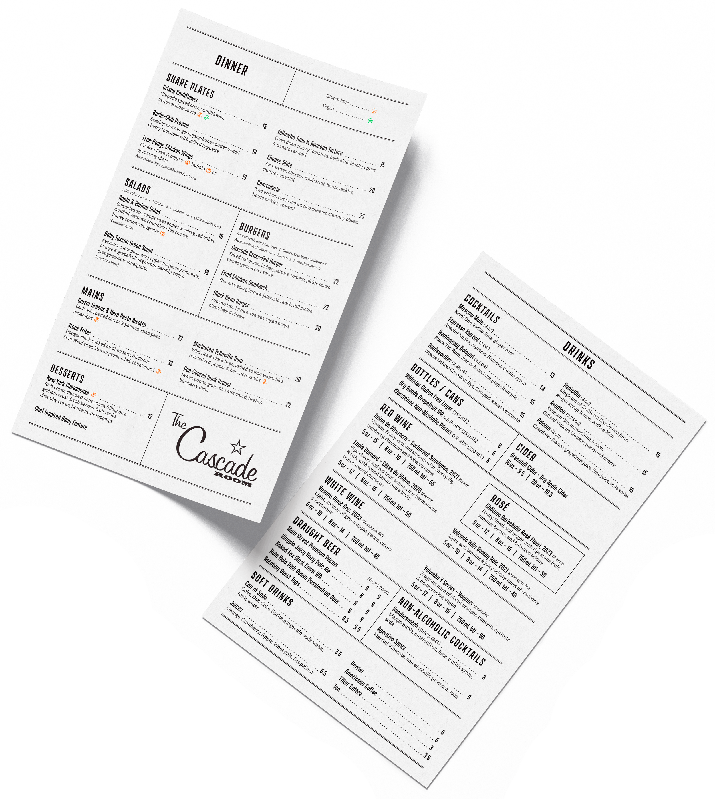 The Cascade Room is a restaurant known for its upscale but relaxed British pub-inspired atmosphere. The defining graphic feature is the use of Oxford rules—divider lines consisting of one thick and one thin stroke. This choice serves two purposes: