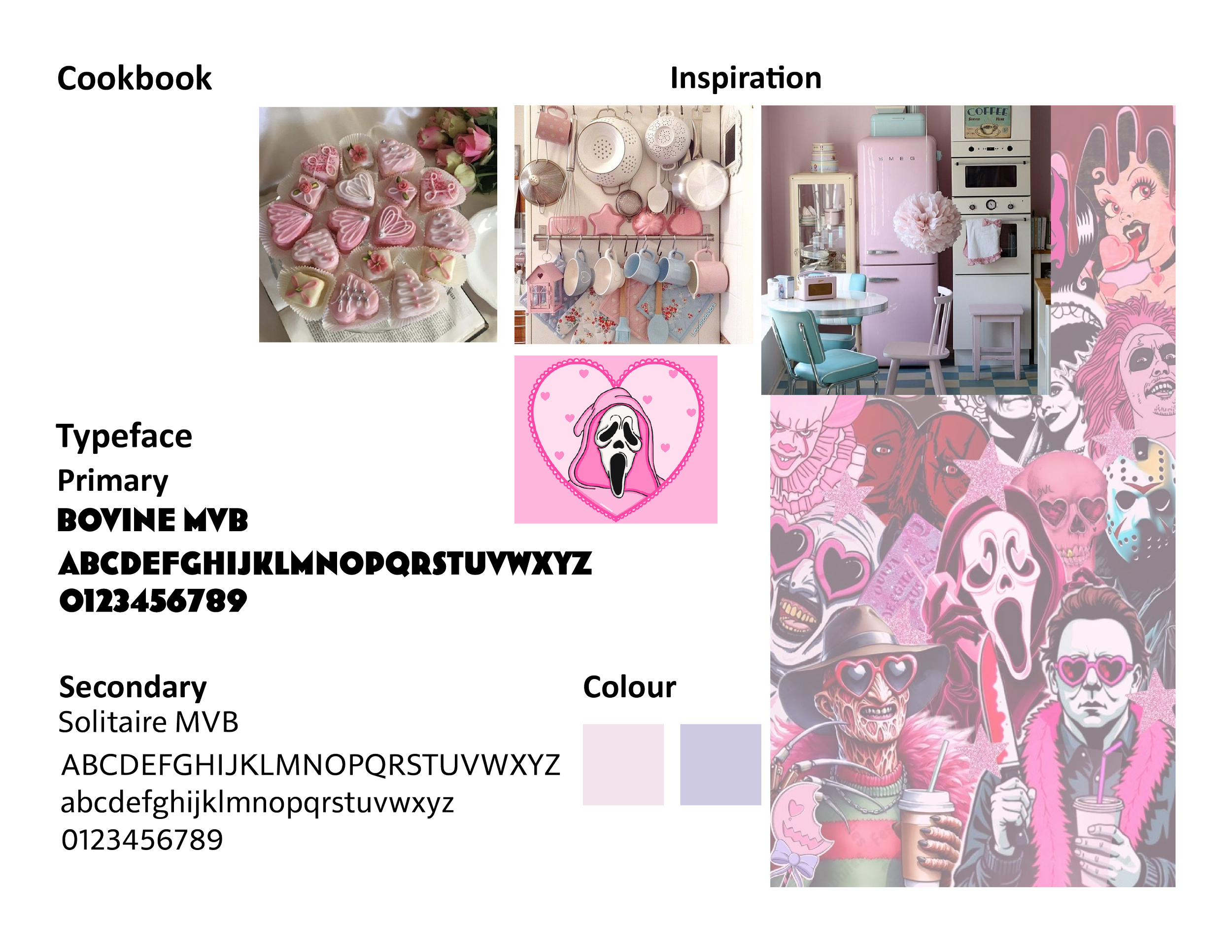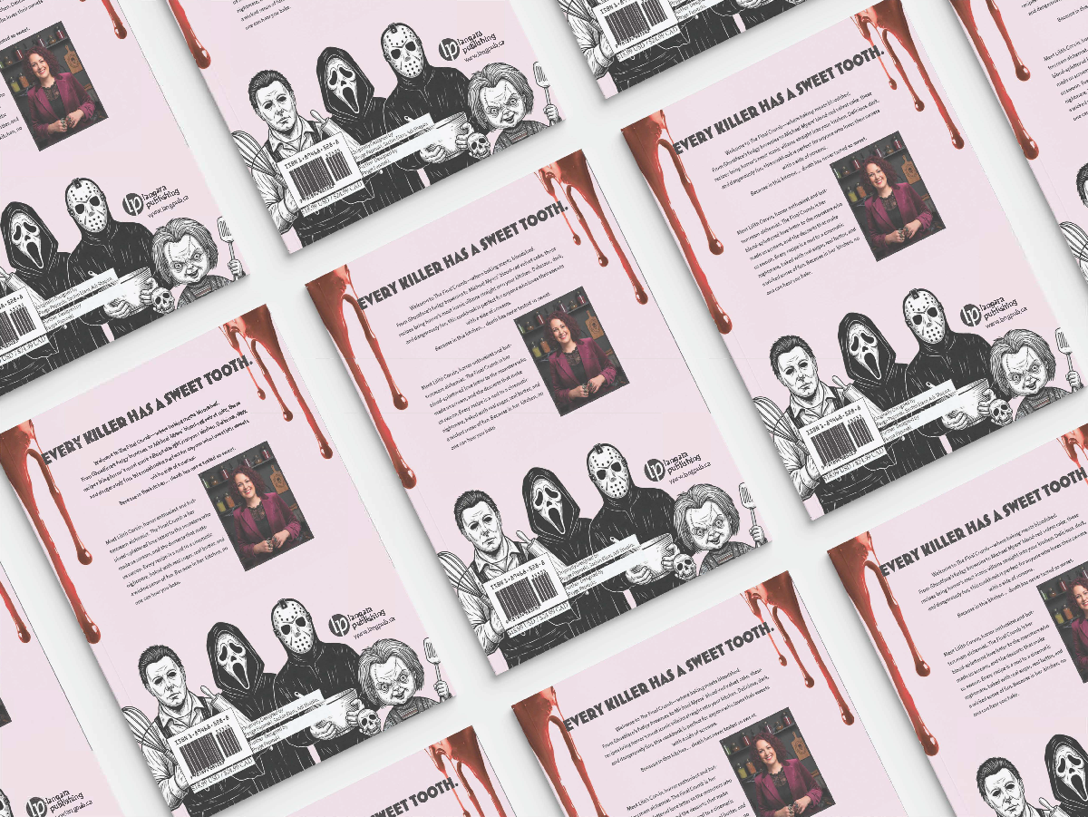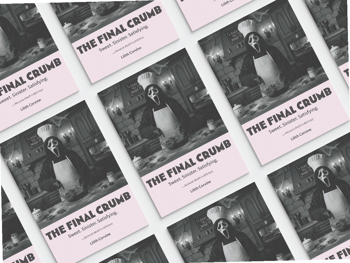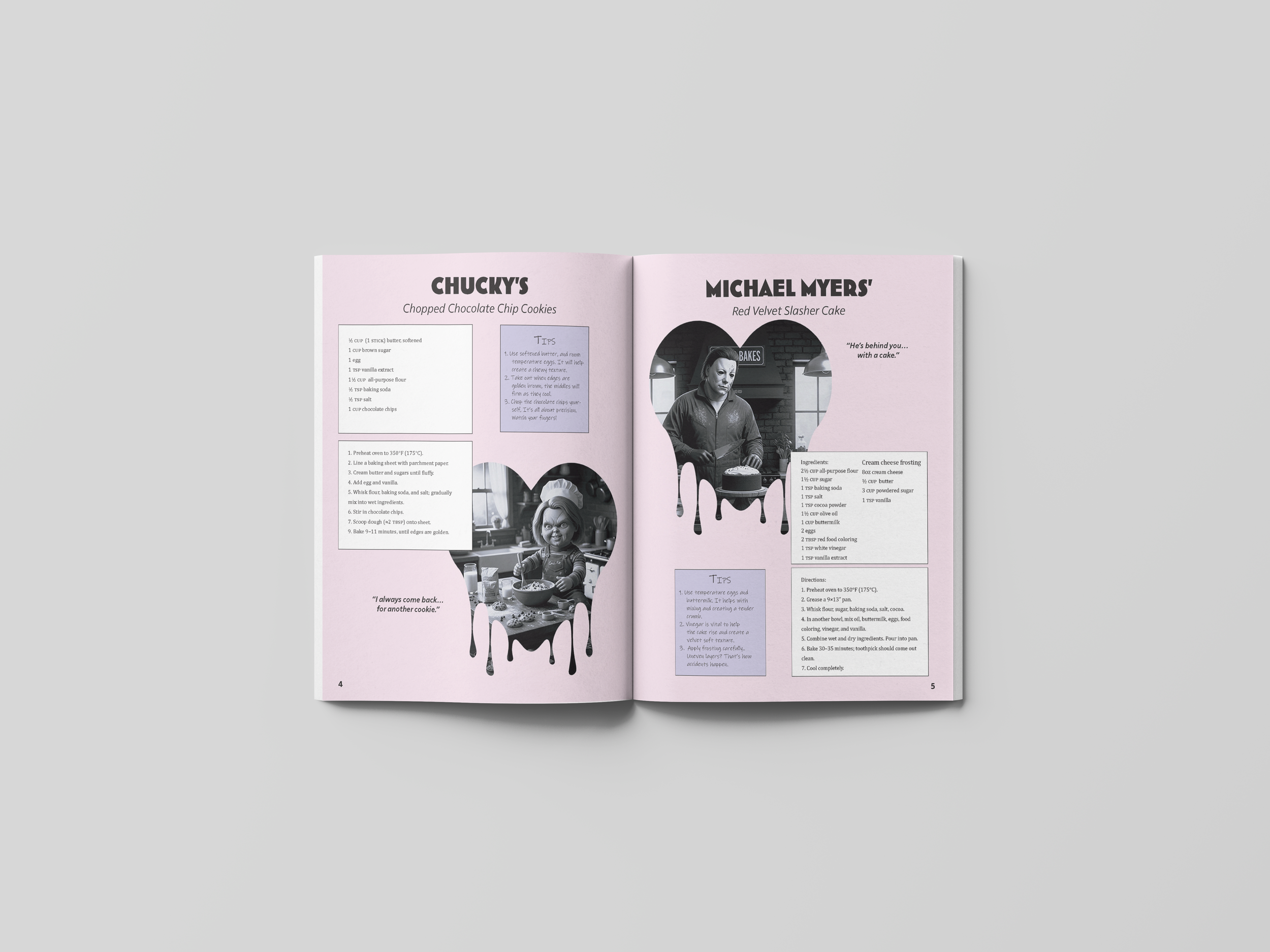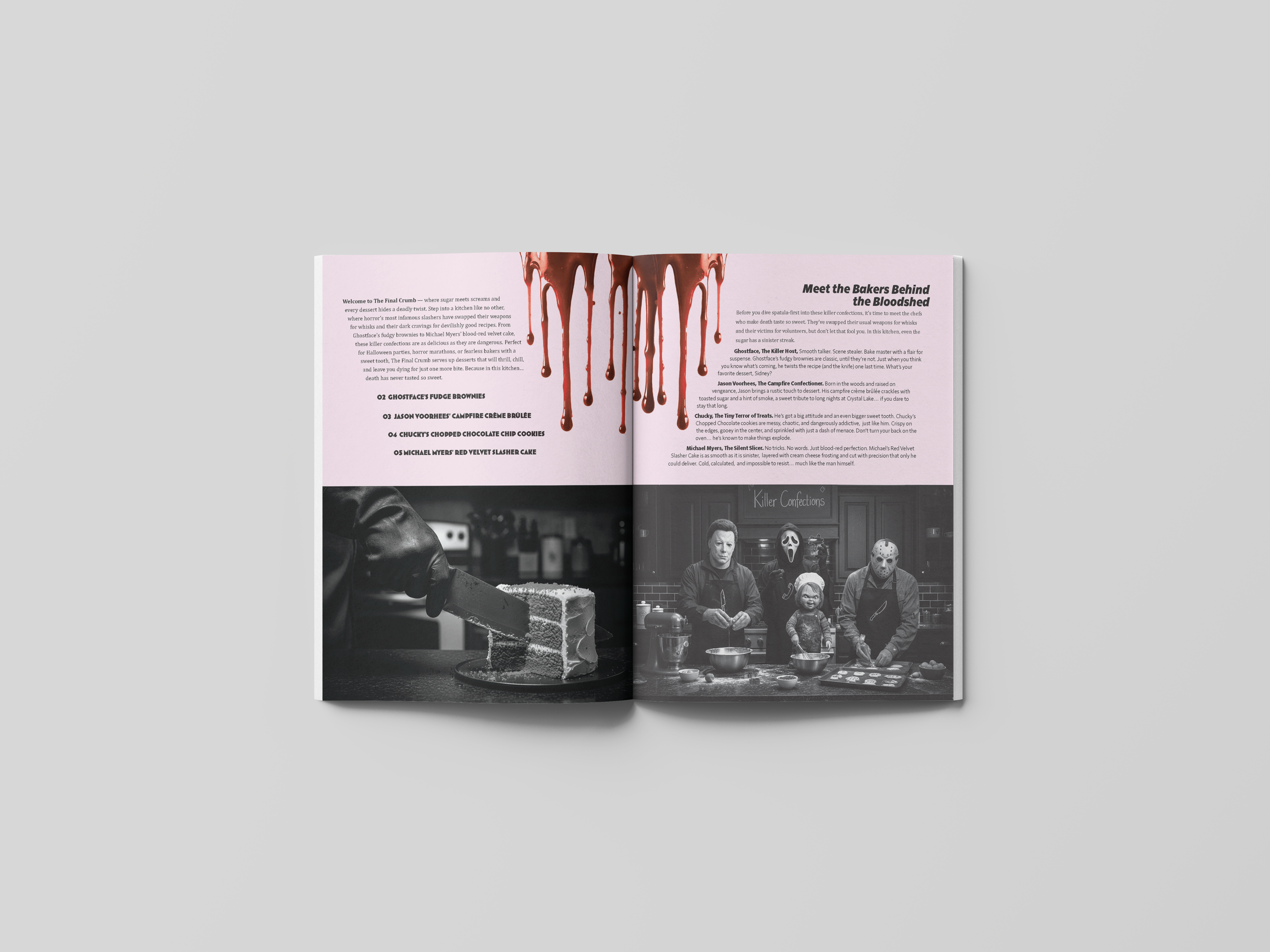 Process: This baking book features iconic horror characters like Ghostface, Chucky, Jason, and Michael Myers. l generated each image using Adobe Firefly, to create a cute and hilarious take on these well-known figures. The images are paired with clear recipe layouts, using consistent typography and page structure to keep the book readable while letting the visuals add personality and humour throughout.