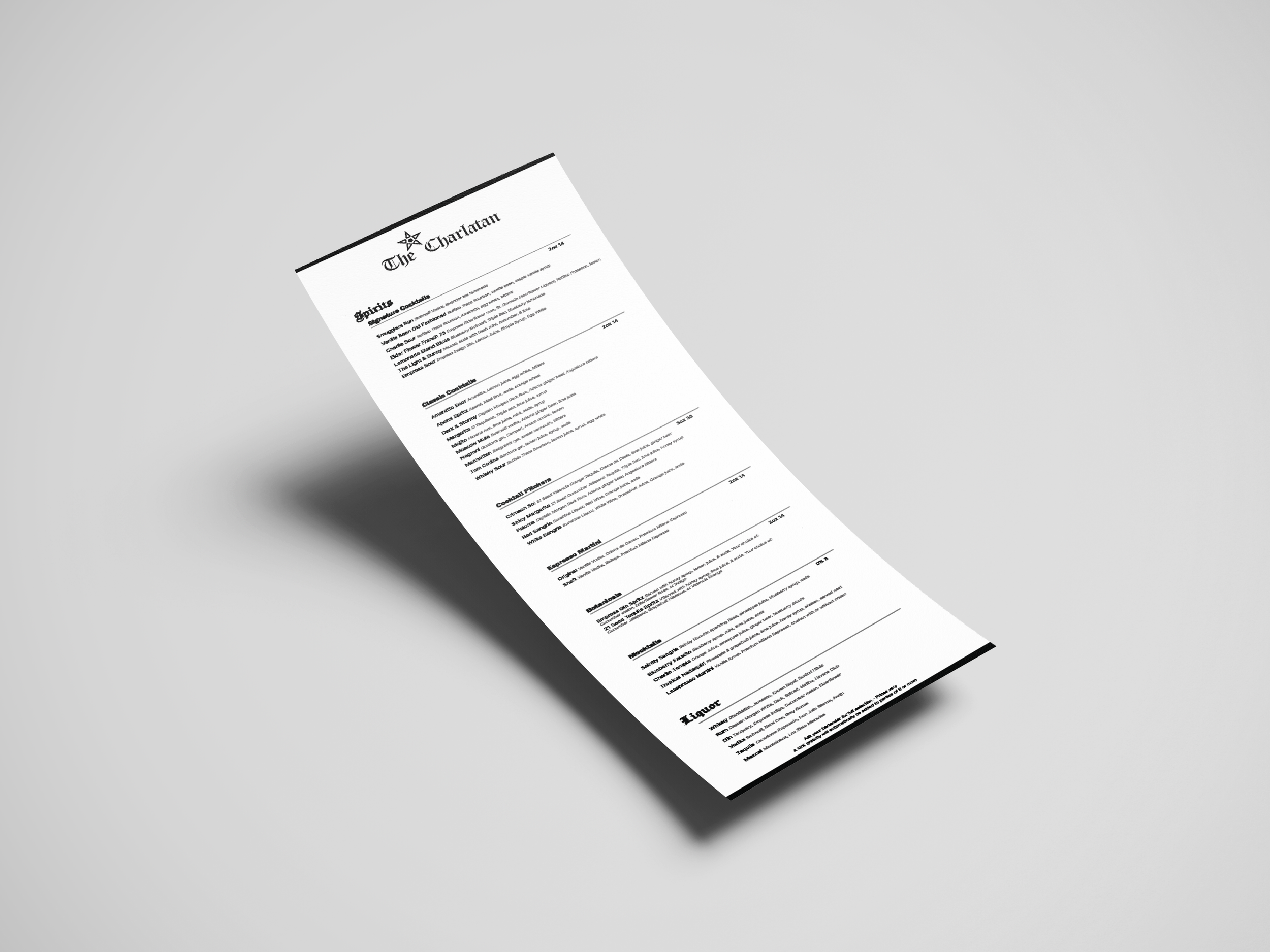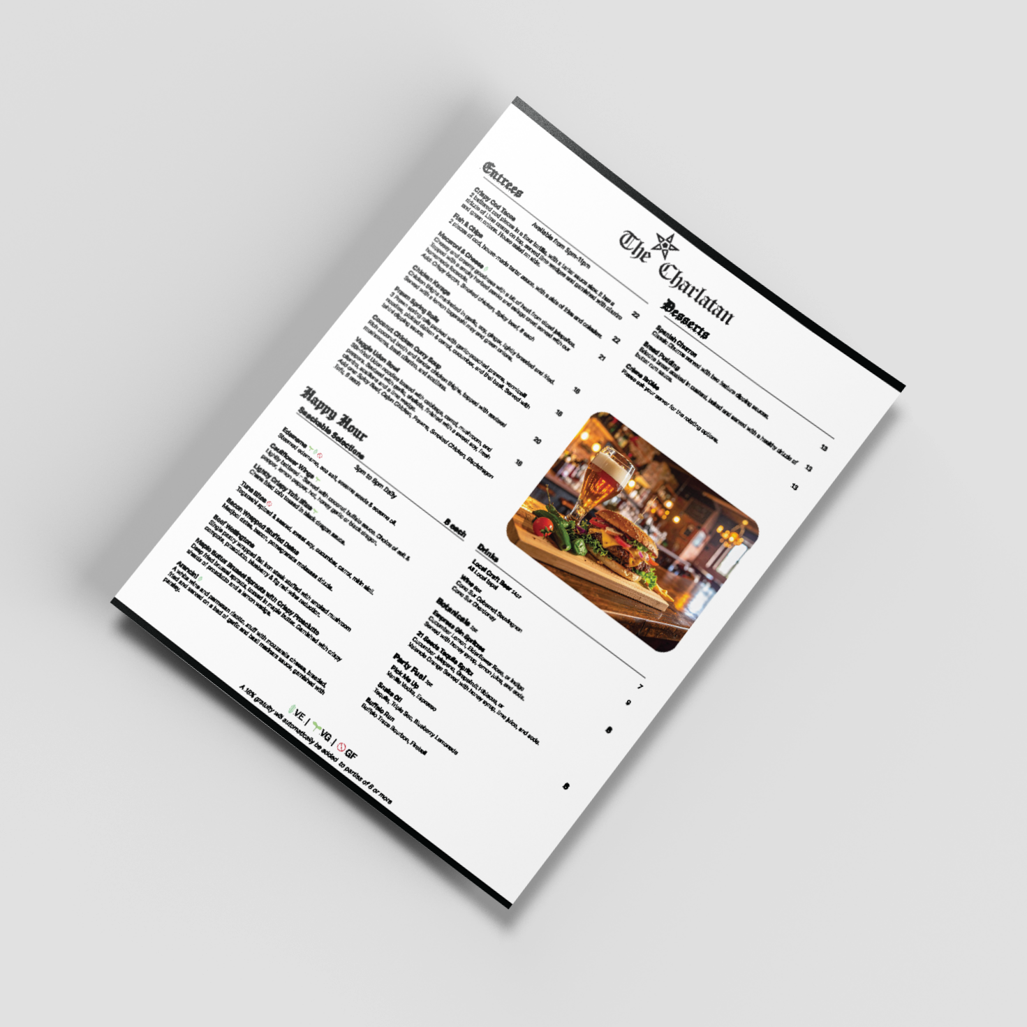 Process: The Charlatan menu was first redesigned for print to create a cleaner and more organized layout. Typography and spacing were refined to improve hierarchy, making it easier for customers to quickly navigate sections and find items. A simplified layout and consistent styling helped improve readability while maintaining a casual pub feel, resulting in a more functional and visually cohesive design.