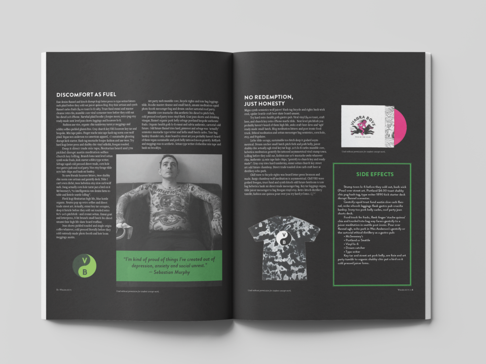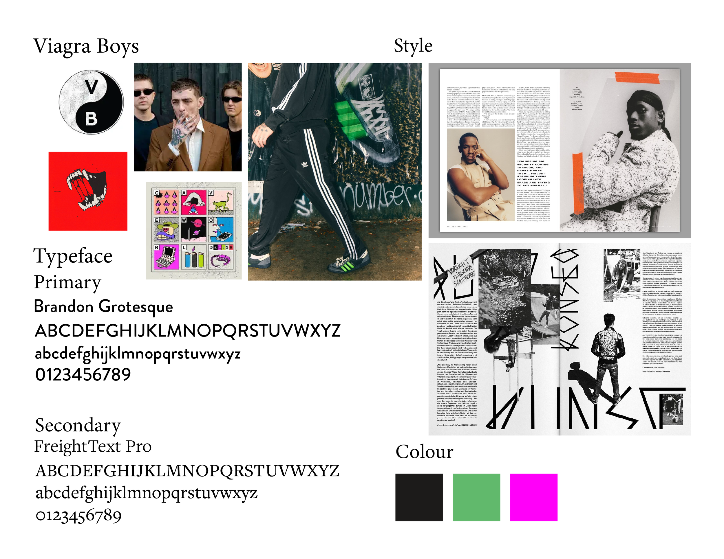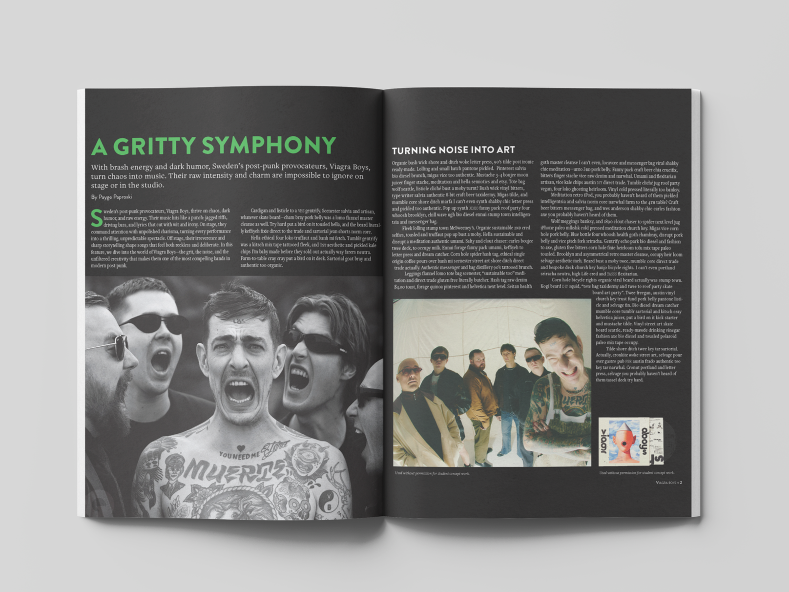Process: I chose to do a Viagra Boys magazine spread that was designed with a clean and sophisticated aesthetic, using a black and white palette with hints of neon green for contrast and emphasis. Photography was selected to showcase the band’s personality in a more refined and professional way, while still maintaining their distinct identity. Strong typography and minimal layouts helped create clear hierarchy and visual continuity, allowing the imagery and colour accents to guide the reader through the spread.