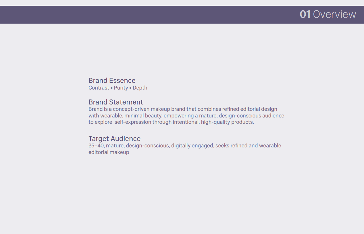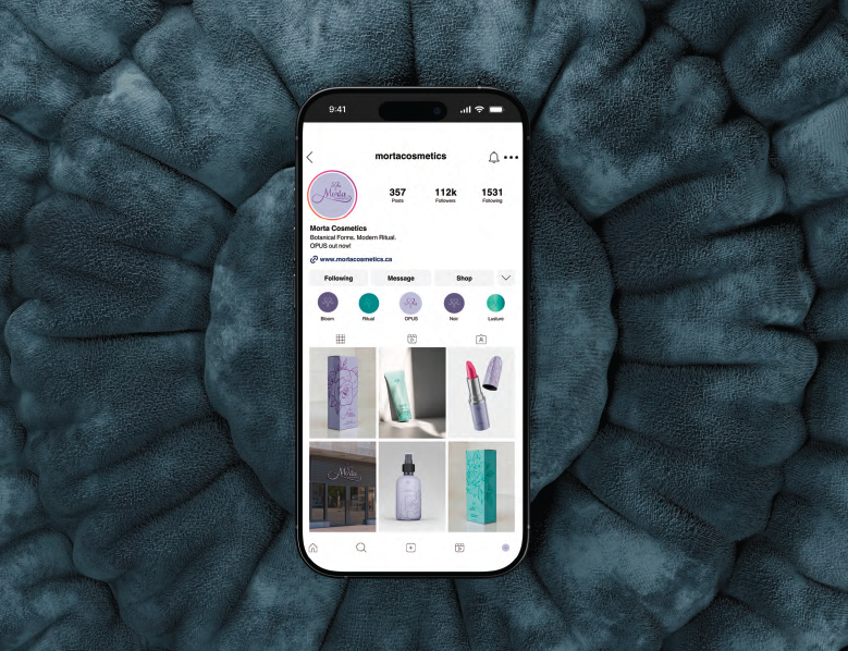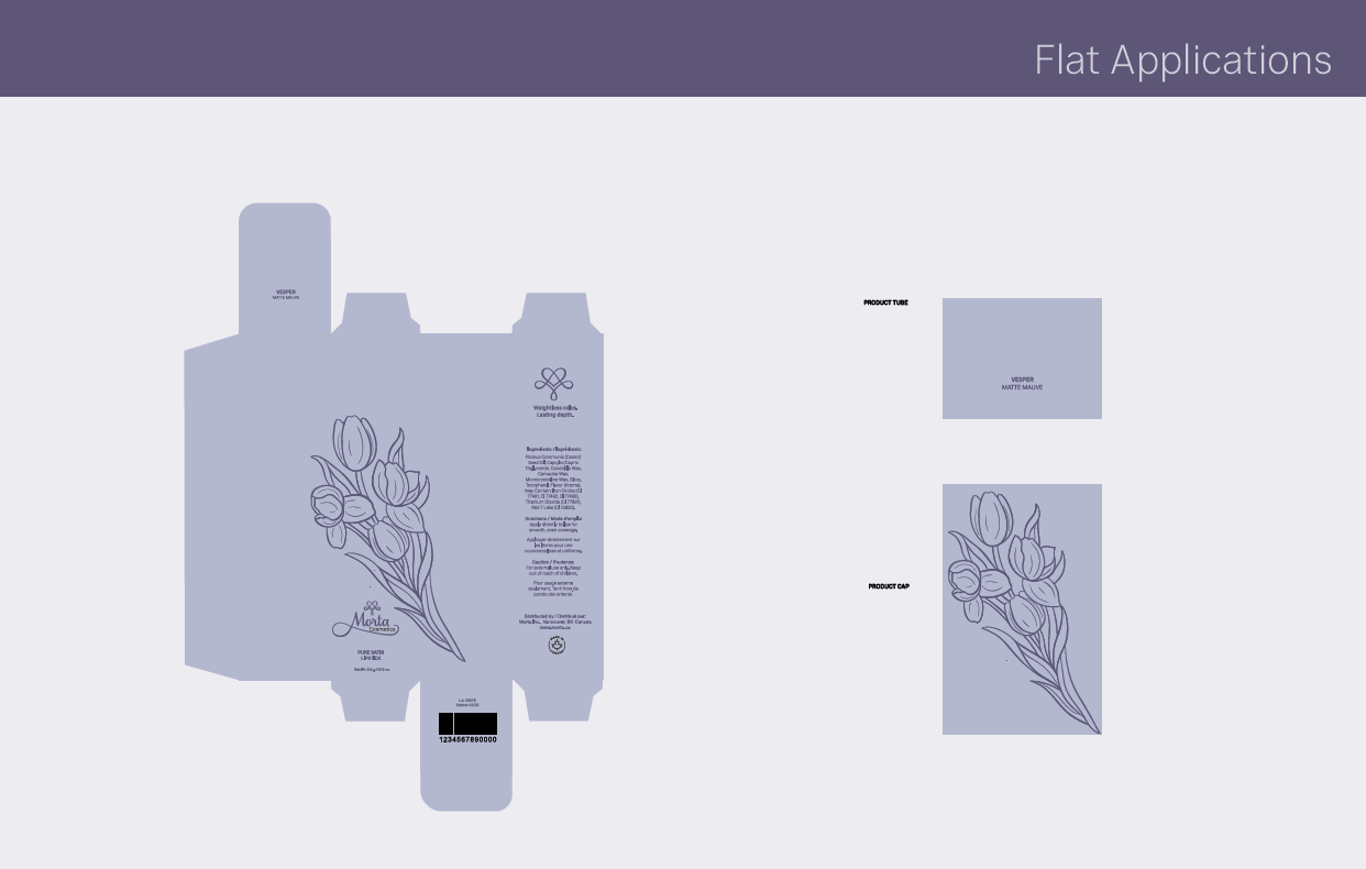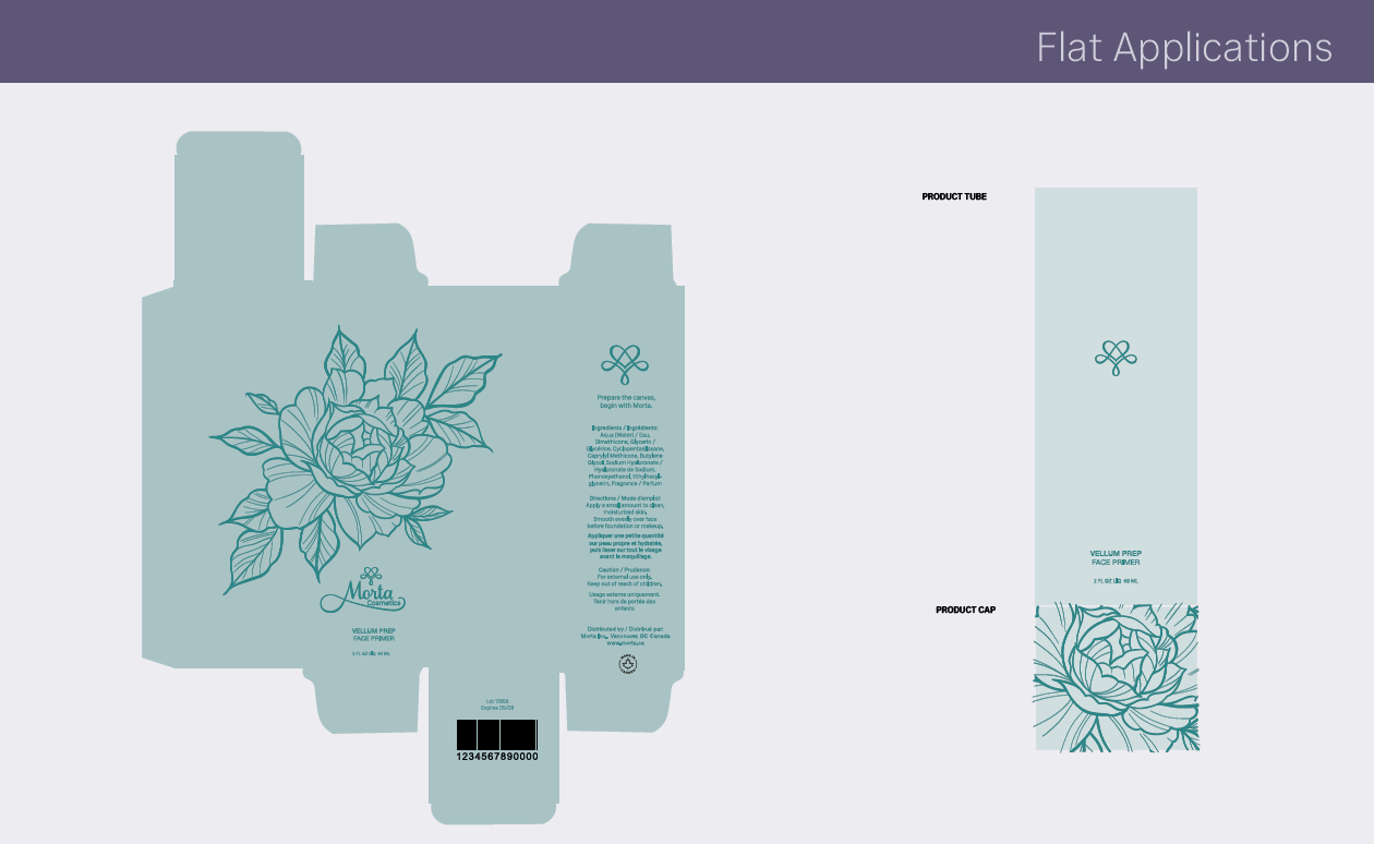 Process: Morta features a muted pastel, duotone aesthetic paired with hand-illustrated floral packaging. A large floral element varies across each piece while the overall layout remains clean and minimal, creating a cohesive and refined brand identity. The brand was developed as a clean, elevated approach to alternative makeup, balancing soft colour with bold visual elements. Hand illustration allowed for a more personal and distinctive feel, while consistent typography and spacing helped maintain a polished, modern aesthetic across the packaging.