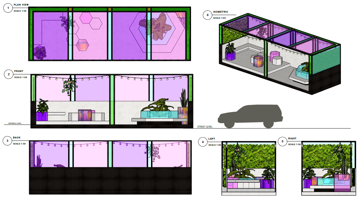 Objective: Design a small Architectural Public Space: a Parklet. Review, apply, and strengthen skills with 3D modelling and 2D drawing tools, both in the design development and communication processes, while exploring design principles and spatial awareness concepts.