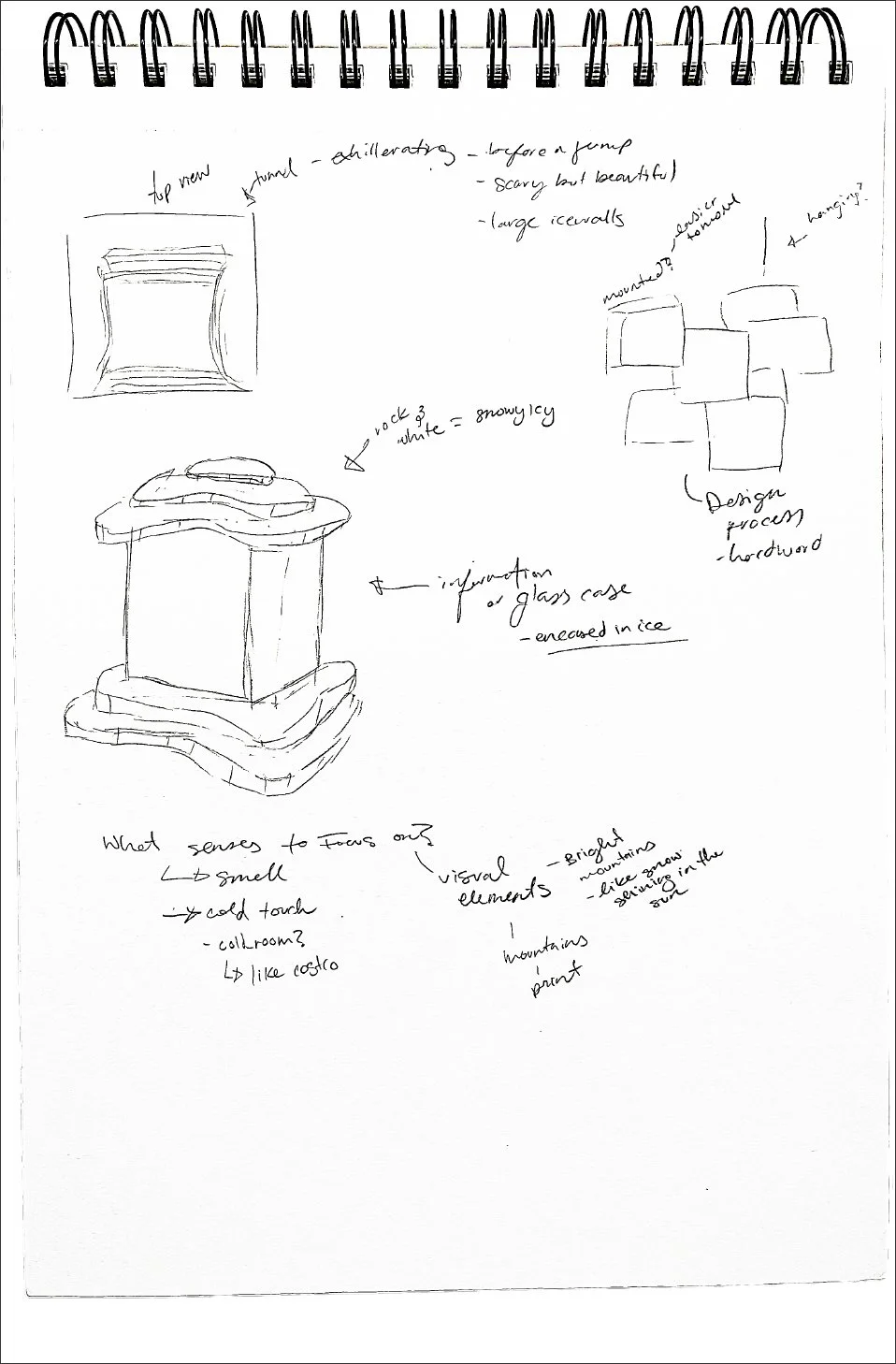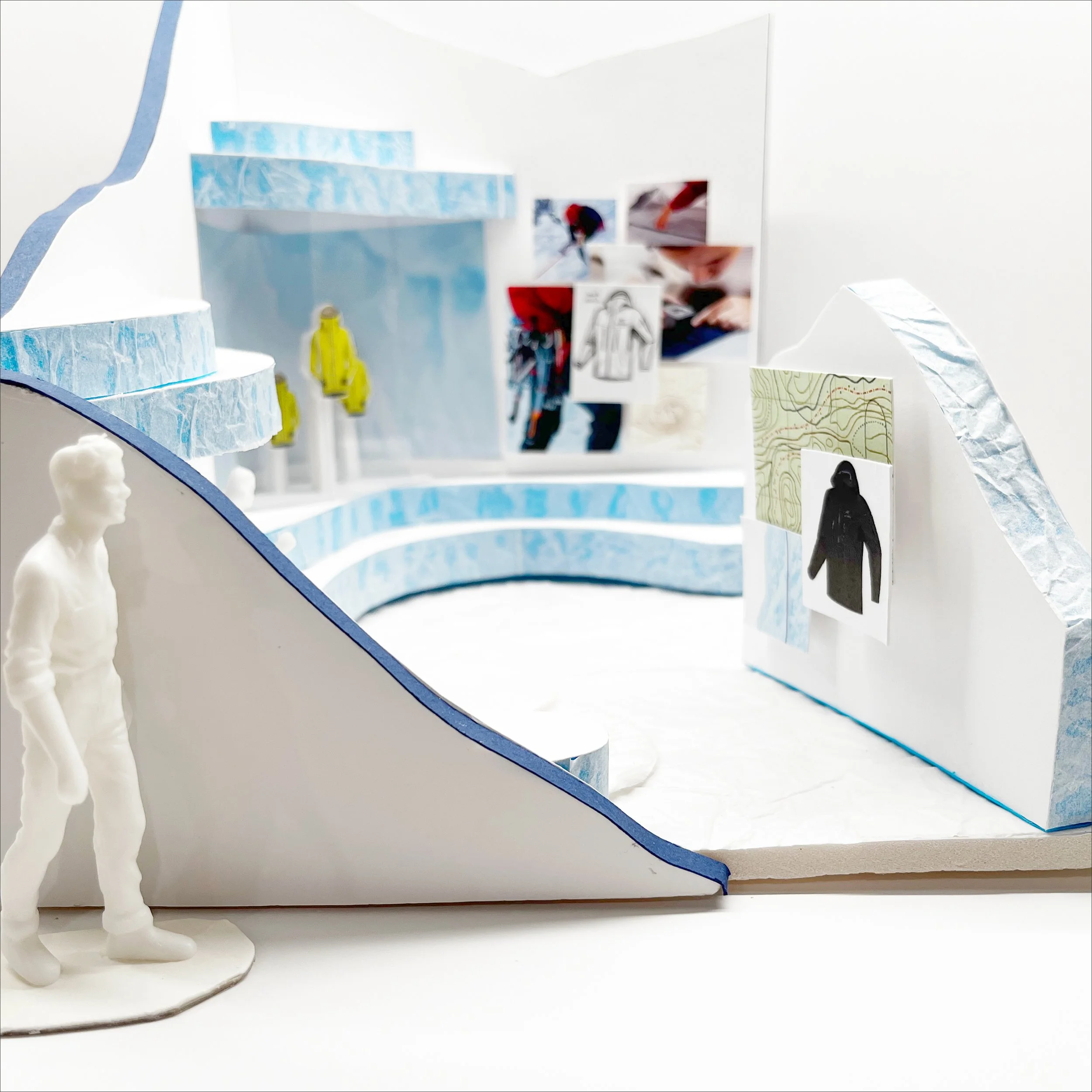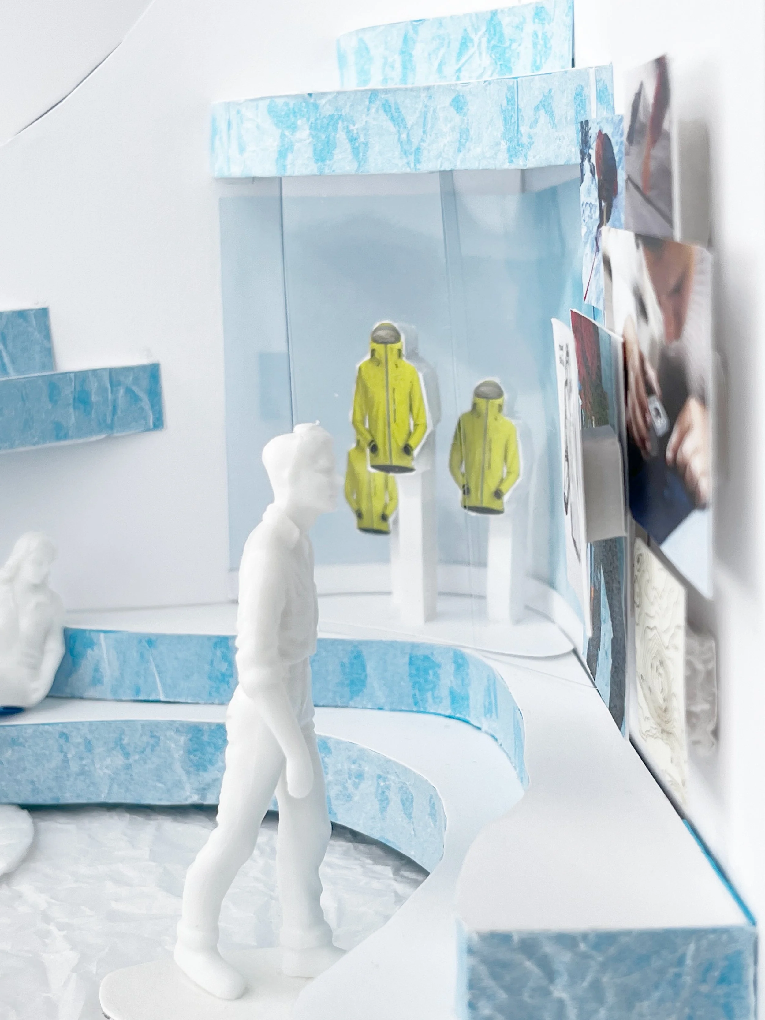 Inspired by the design process of the jacket, I included a process portion showcasing the resilience and perseverance that is expressed by my initial research. The various images show inspirations, methods, and testing done in the process. I took inspiration from topographic maps to create the seating areas. To showcase the jackets I wanted to split the topographic portions and crystallize the jackets and have them well-lit being the focal point. After trying on the jacket, I wanted to implement how light and airy the jacket is which is why I chose a blue and white colour palette. To further convey the cold and iciness of ice climbing, I chose different textures like those found in the mountainous areas. I selected a mix of smooth, soft, and rough textures to emulated ice and snow in its’ various states. All the decisions tie into the journey it took to make the perfect ice climbing jacket and showcase the essence of the mountains and the extremity of the sport.