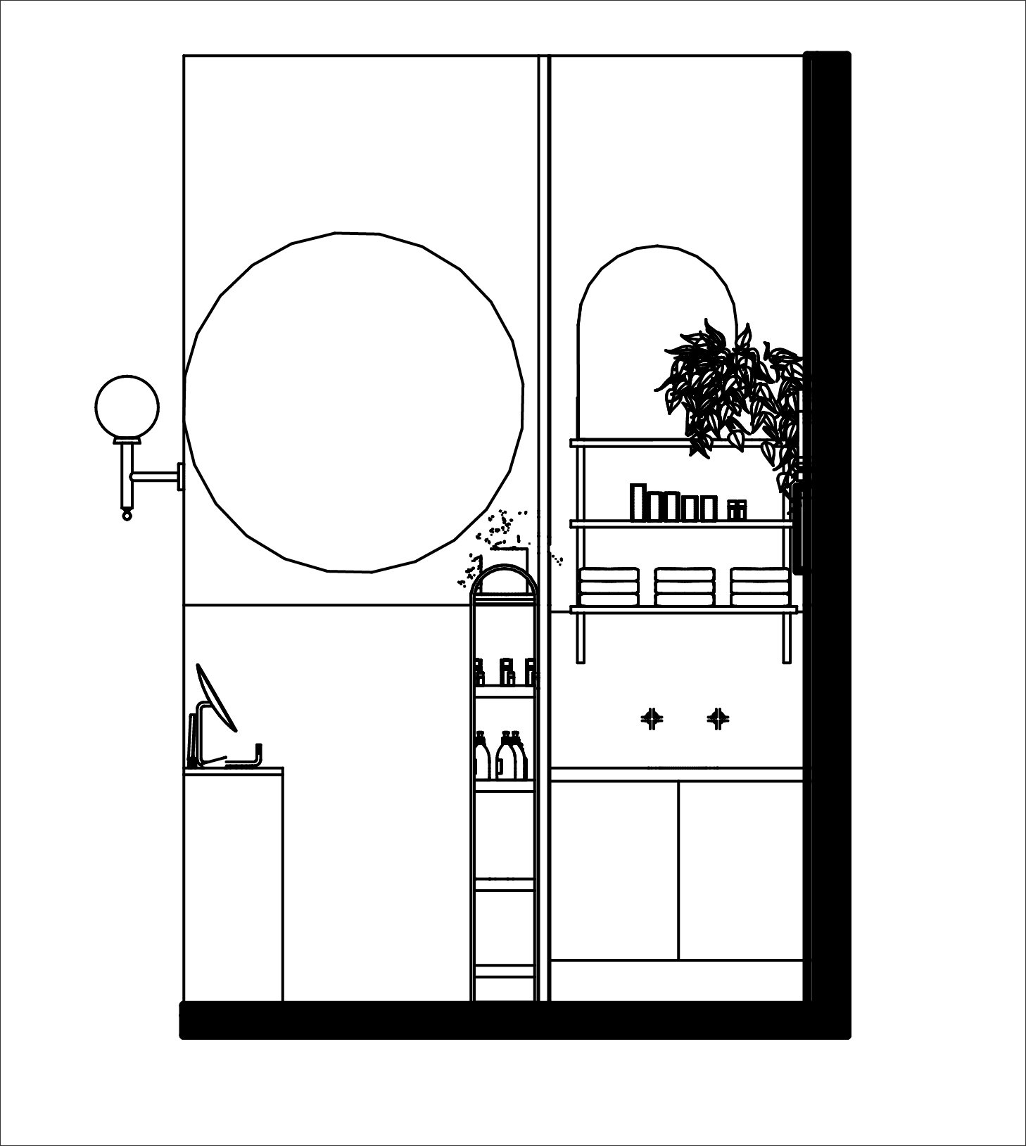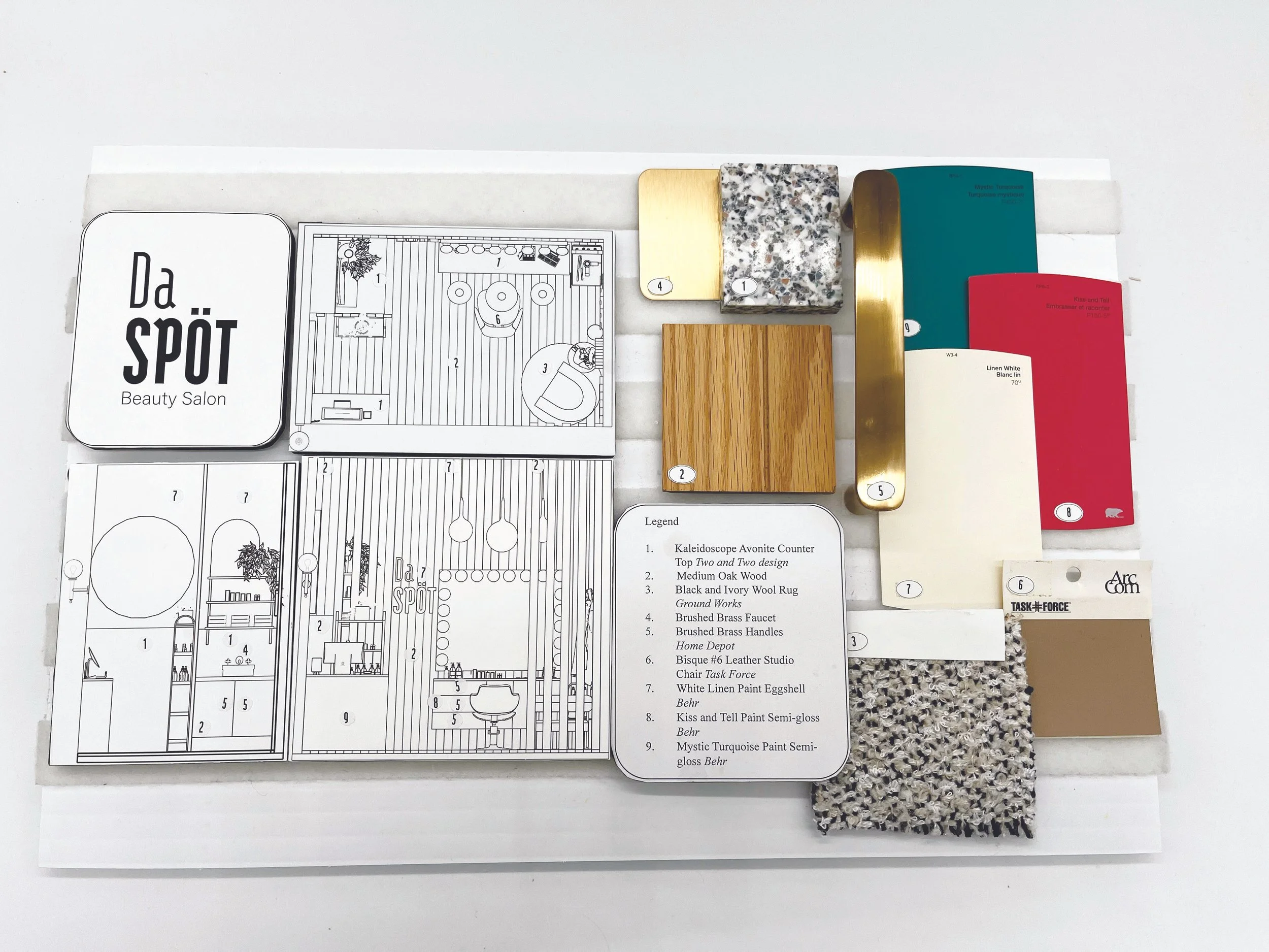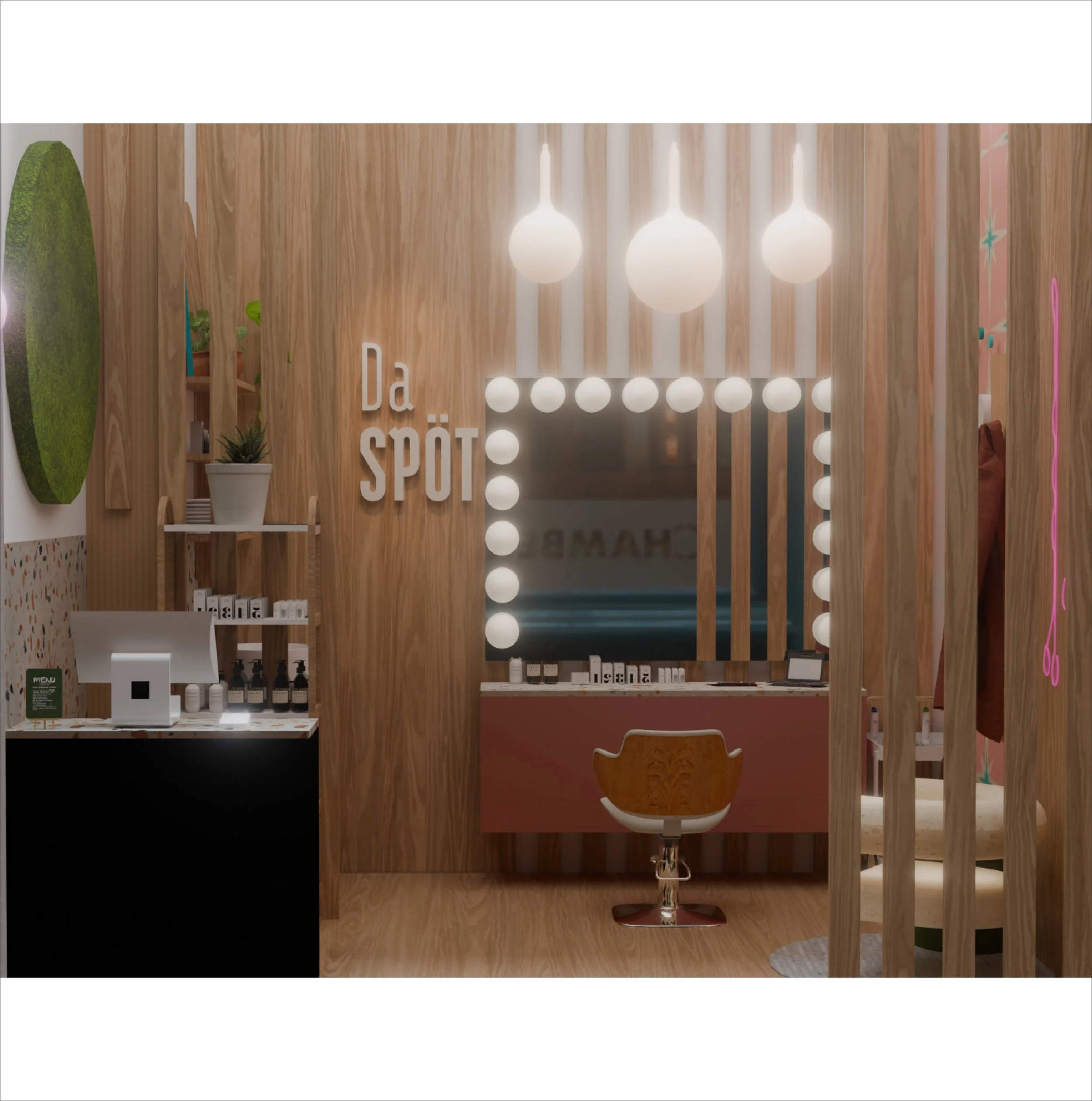 The objective of this project was to design a functional 8’ × 12’ mini salon enclosed by 4.5” thick, 12’ high walls. The randomly assigned theme of 1950s Scandinavian design guided the creation of a fully functional hair and makeup studio. This included all essential elements such as a service chair, sink, POS station, waiting area, and storage.