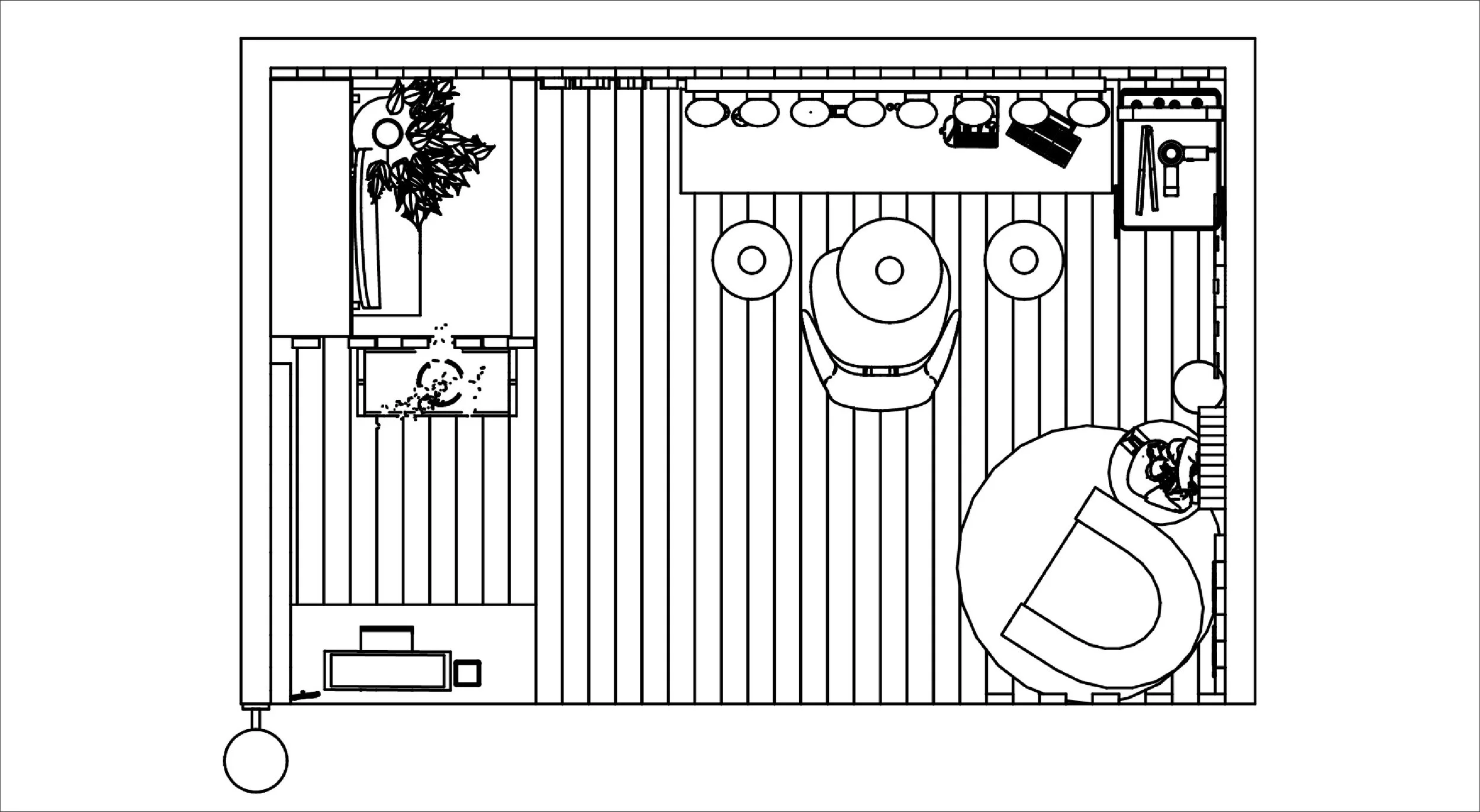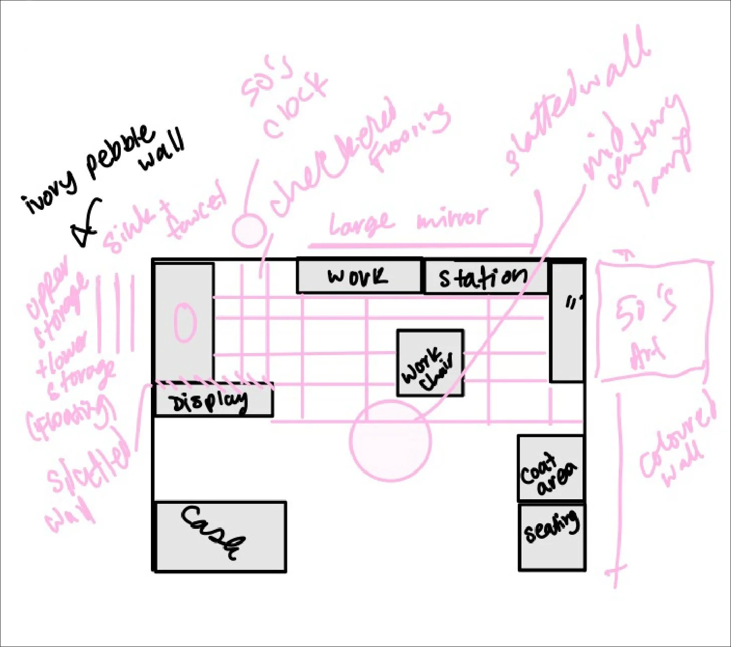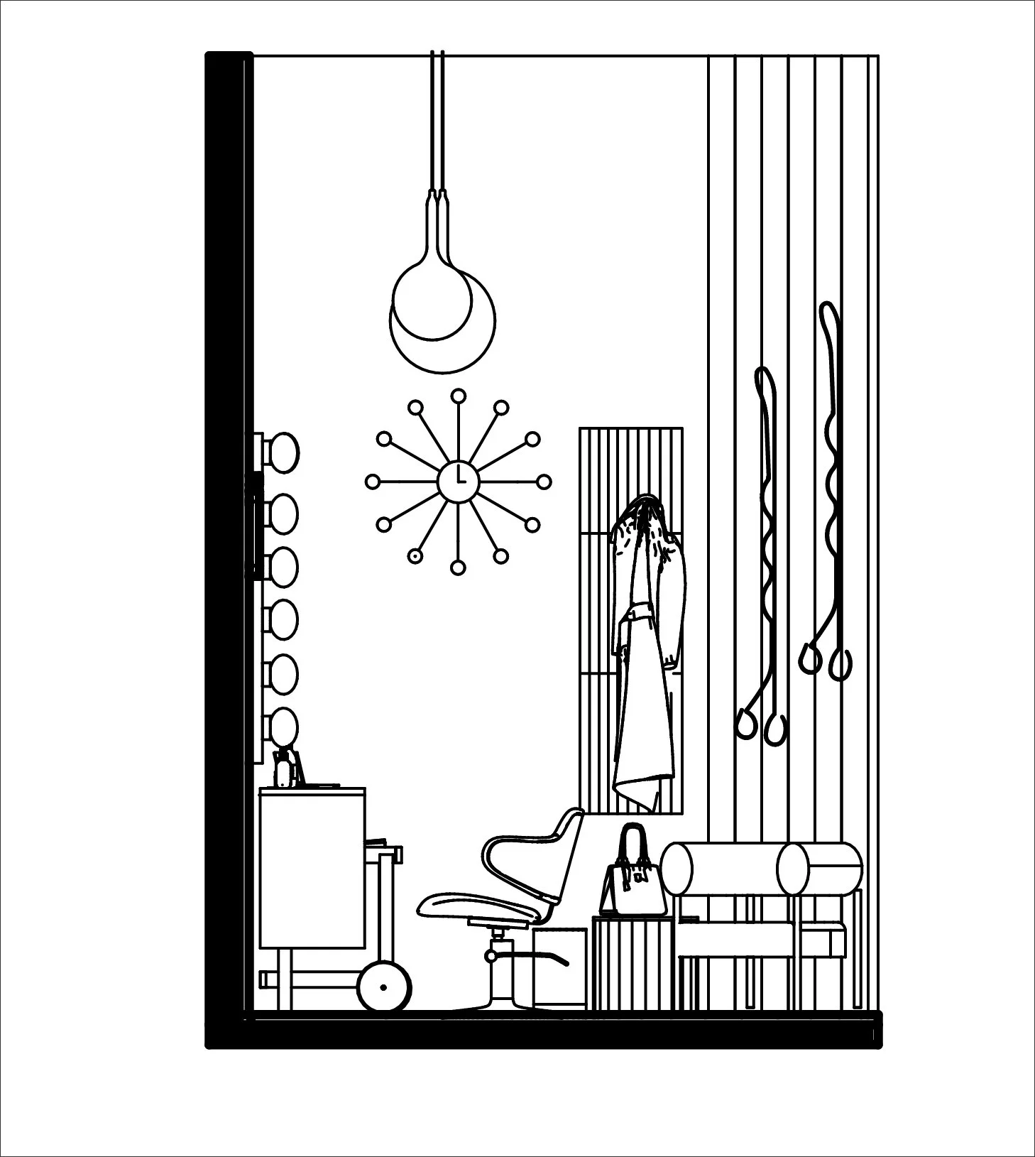 The objective of this project was to design a functional 8’ × 12’ mini salon enclosed by 4.5” thick, 12’ high walls. The randomly assigned theme of 1950s Scandinavian design guided the creation of a fully functional hair and makeup studio. This included all essential elements such as a service chair, sink, POS station, waiting area, and storage.