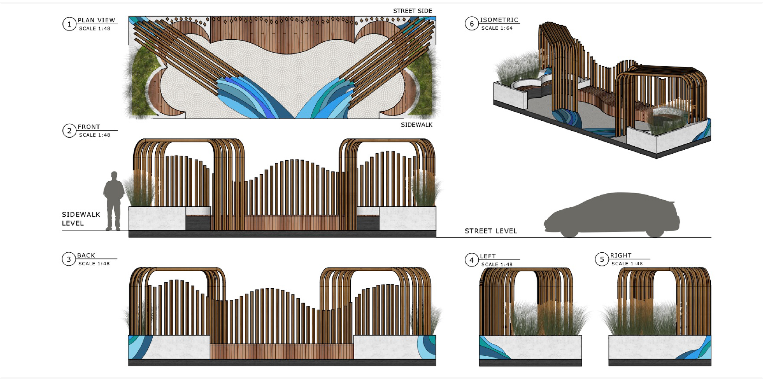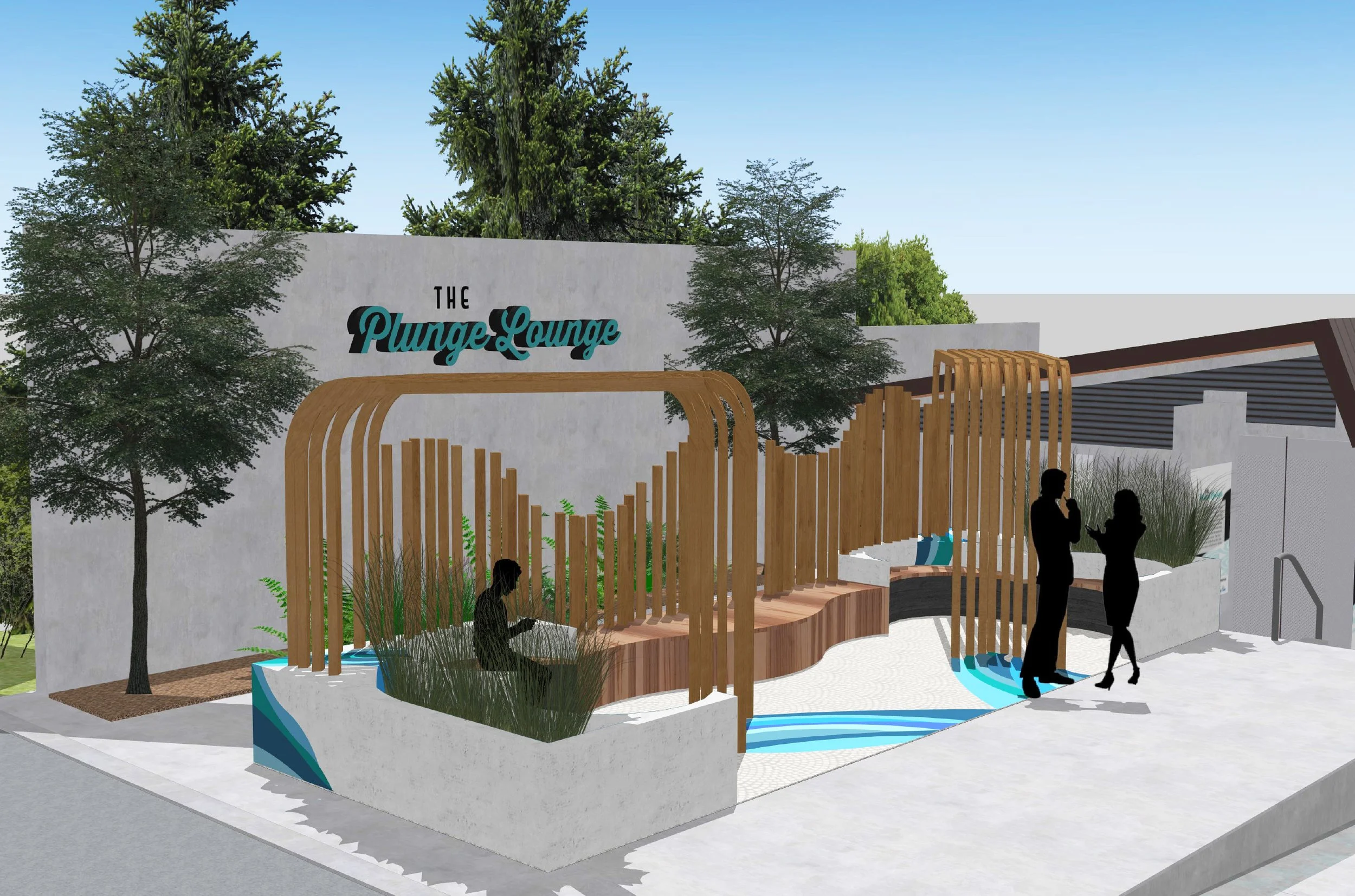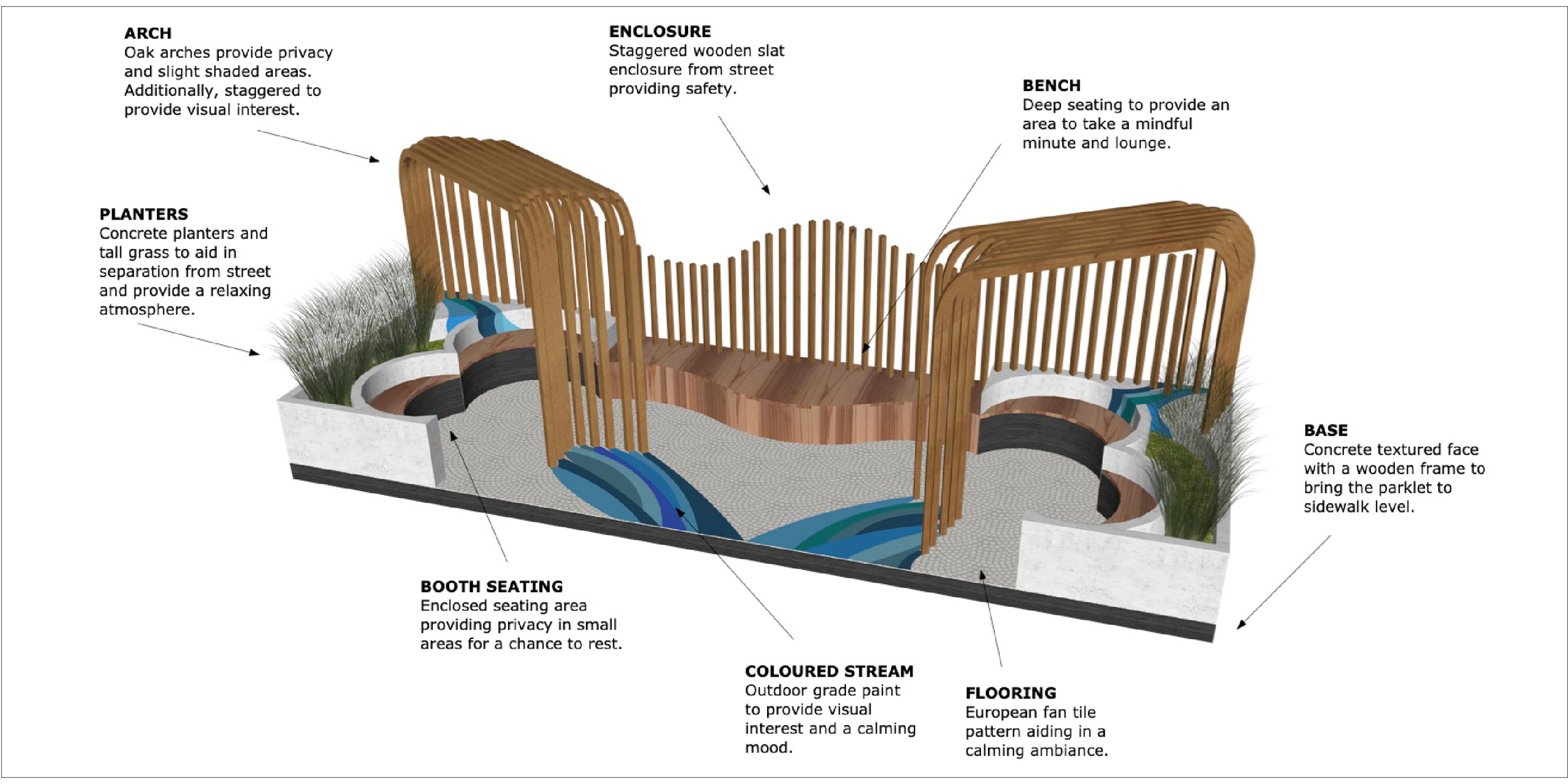 This parklet is inspired by the movement of a waterfall. The cascading forms shape both the seating and architectural elements. Repetition and variation in scale evoke the rhythm of flowing water, creating a calm and restorative atmosphere. The space is intended as a small outdoor retreat for community members seeking tranquility and reflection.