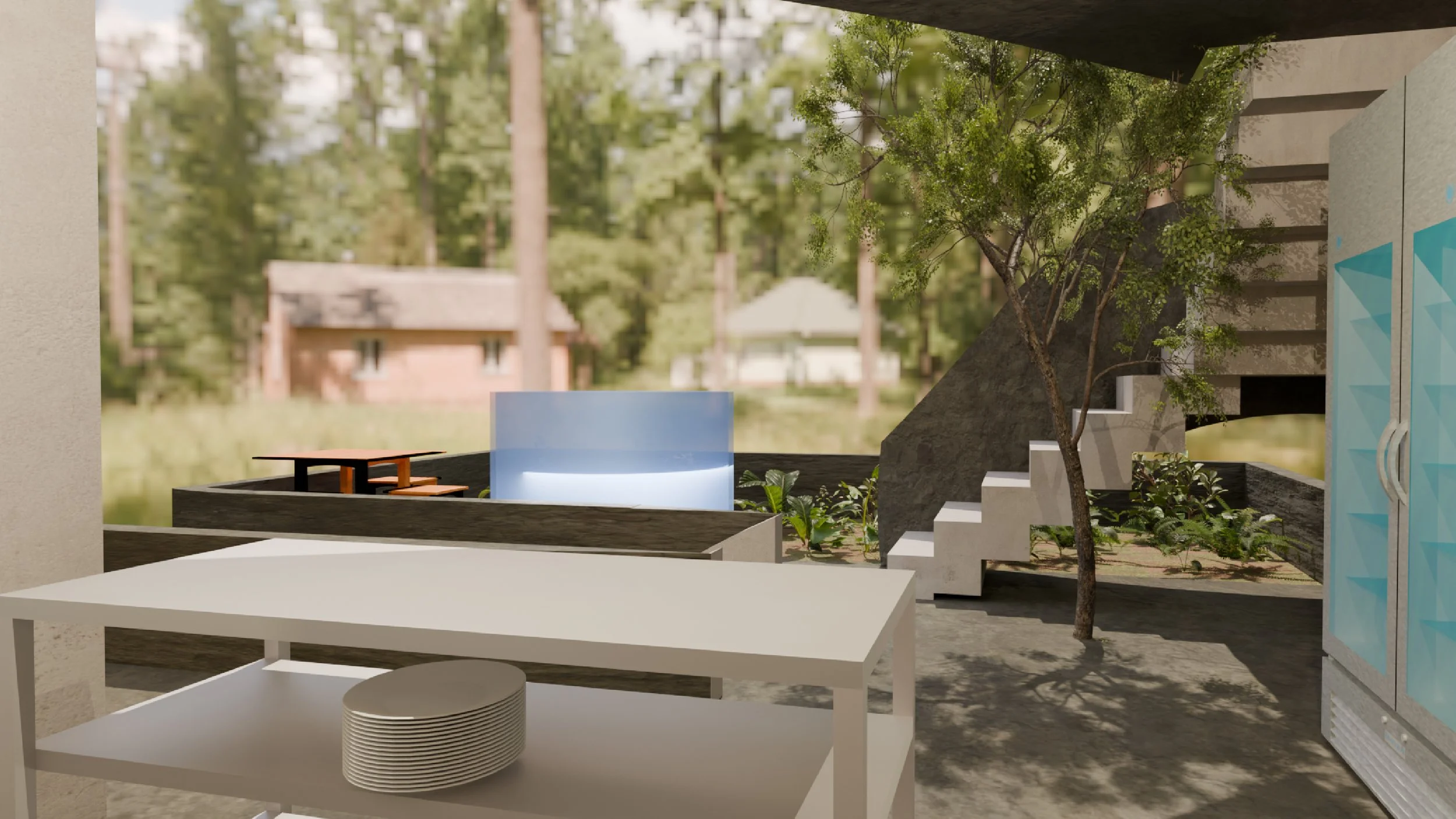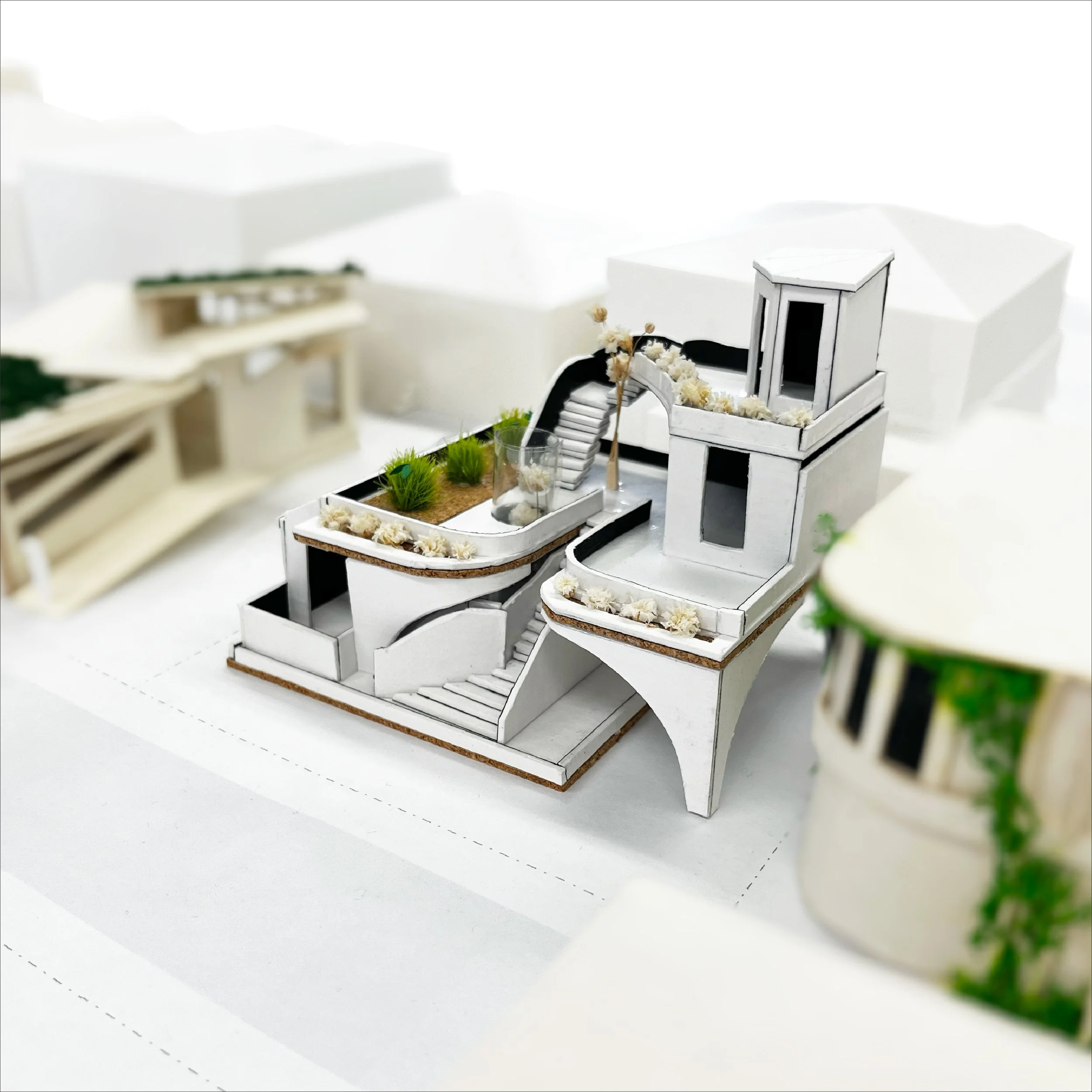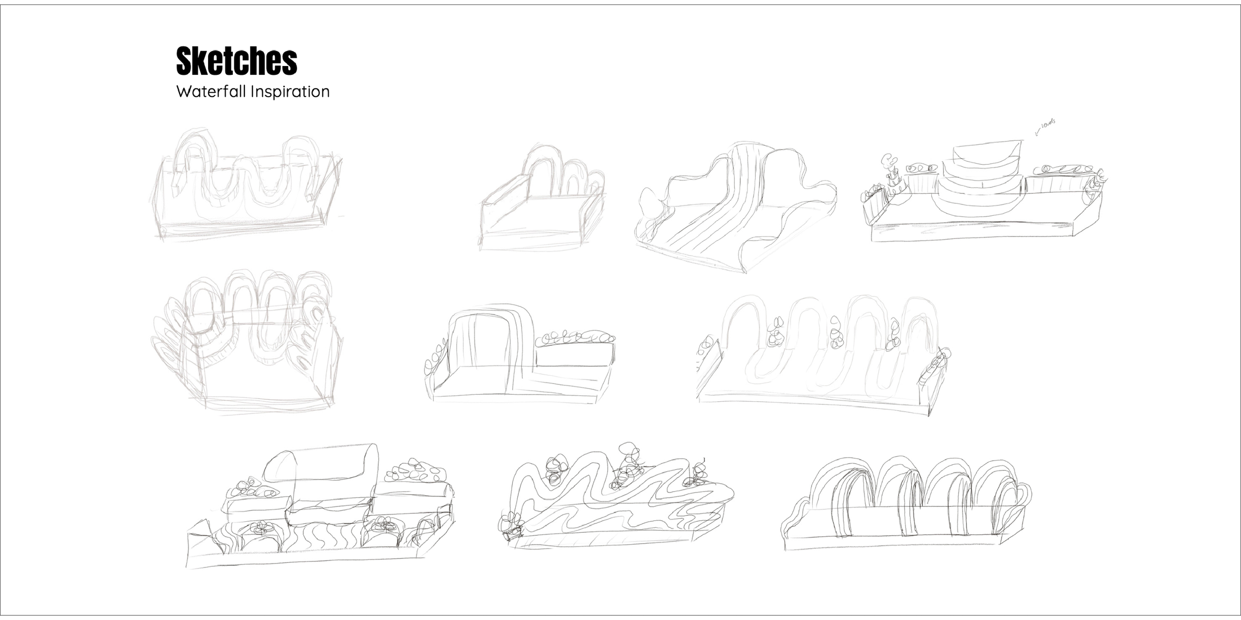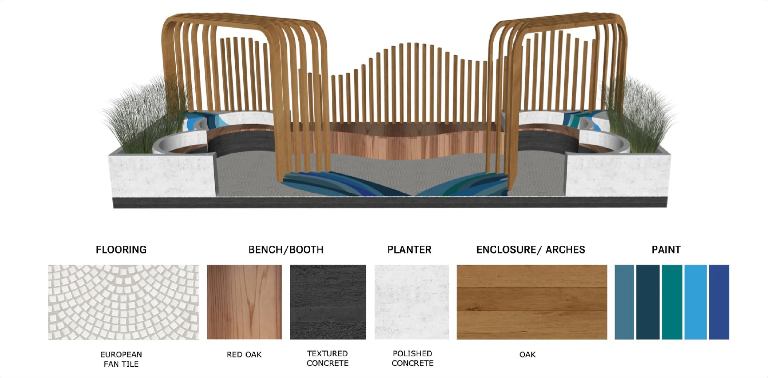 This parklet is inspired by the movement of a waterfall. The cascading forms shape both the seating and architectural elements. Repetition and variation in scale evoke the rhythm of flowing water, creating a calm and restorative atmosphere. The space is intended as a small outdoor retreat for community members seeking tranquility and reflection.