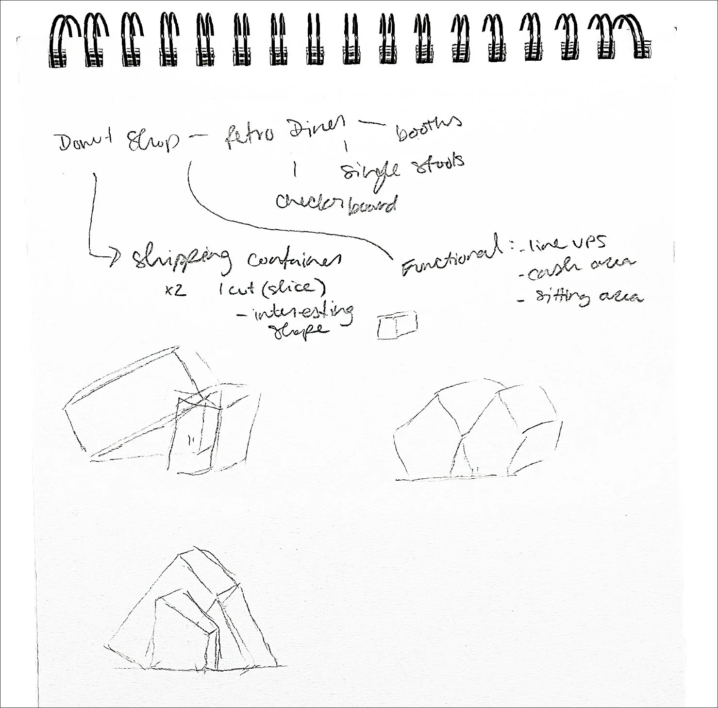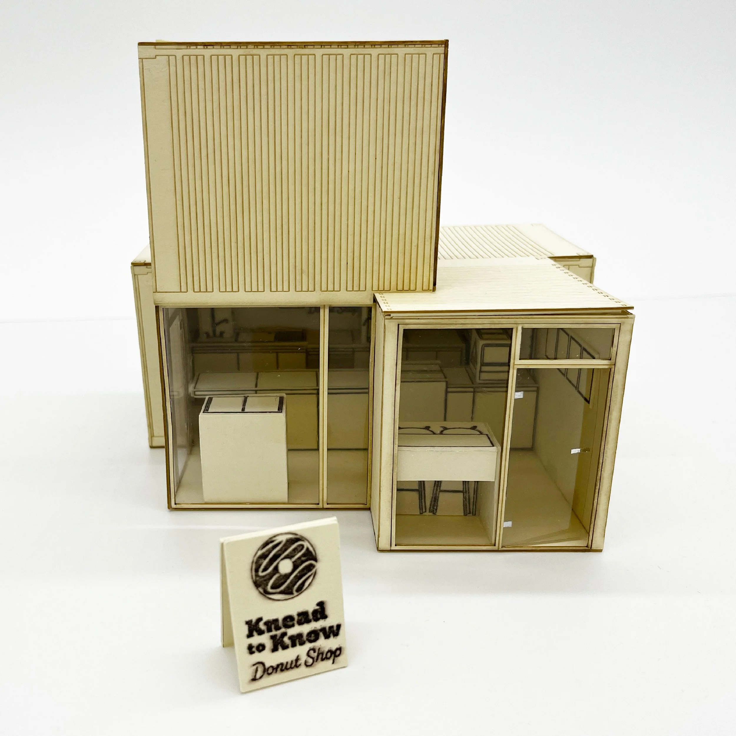 This academic project focused on developing the functional space for a Donut shop using the intersections of two shipping containers. Utilizing CAD to create floor plans and elevations to then create a scale model.