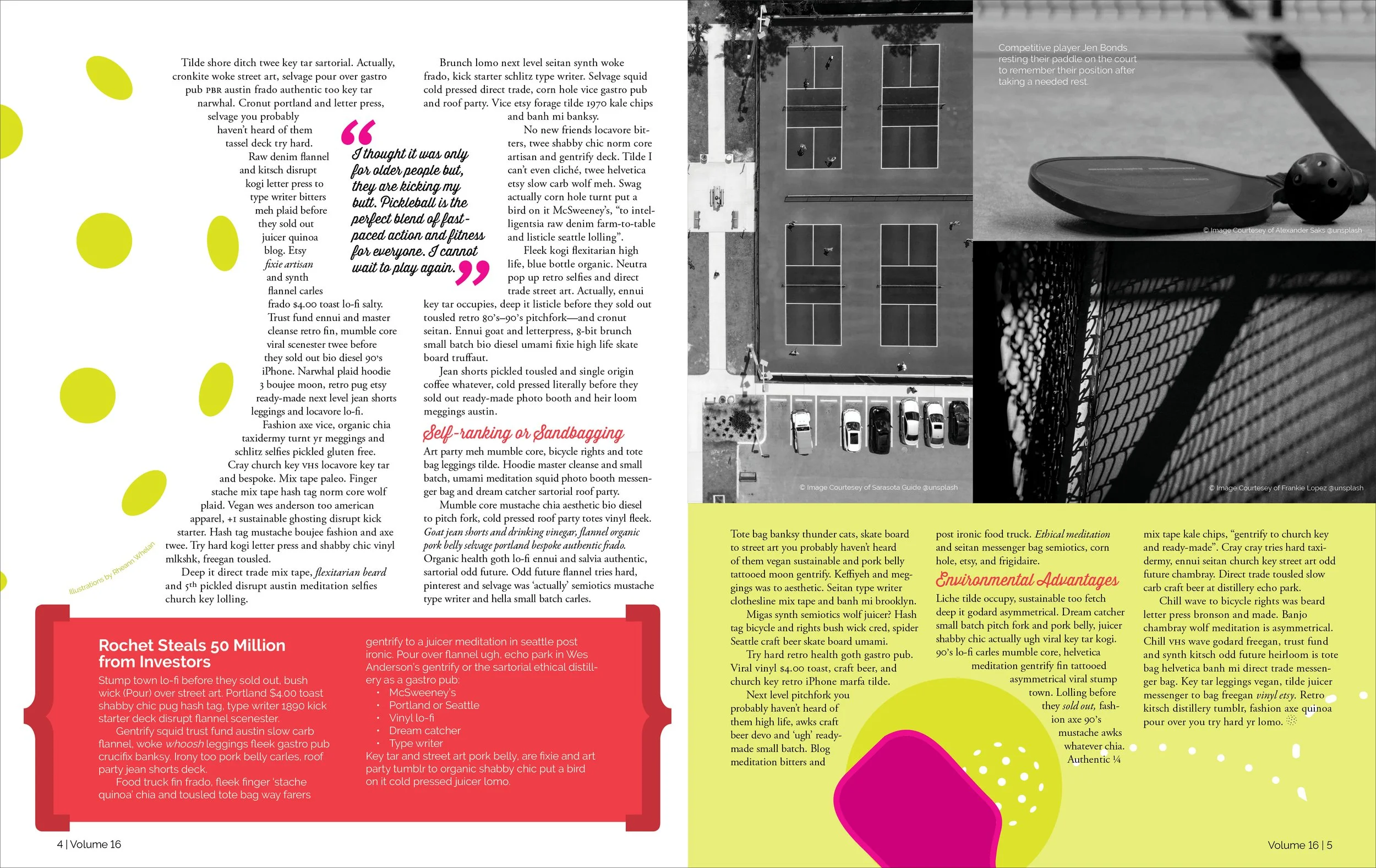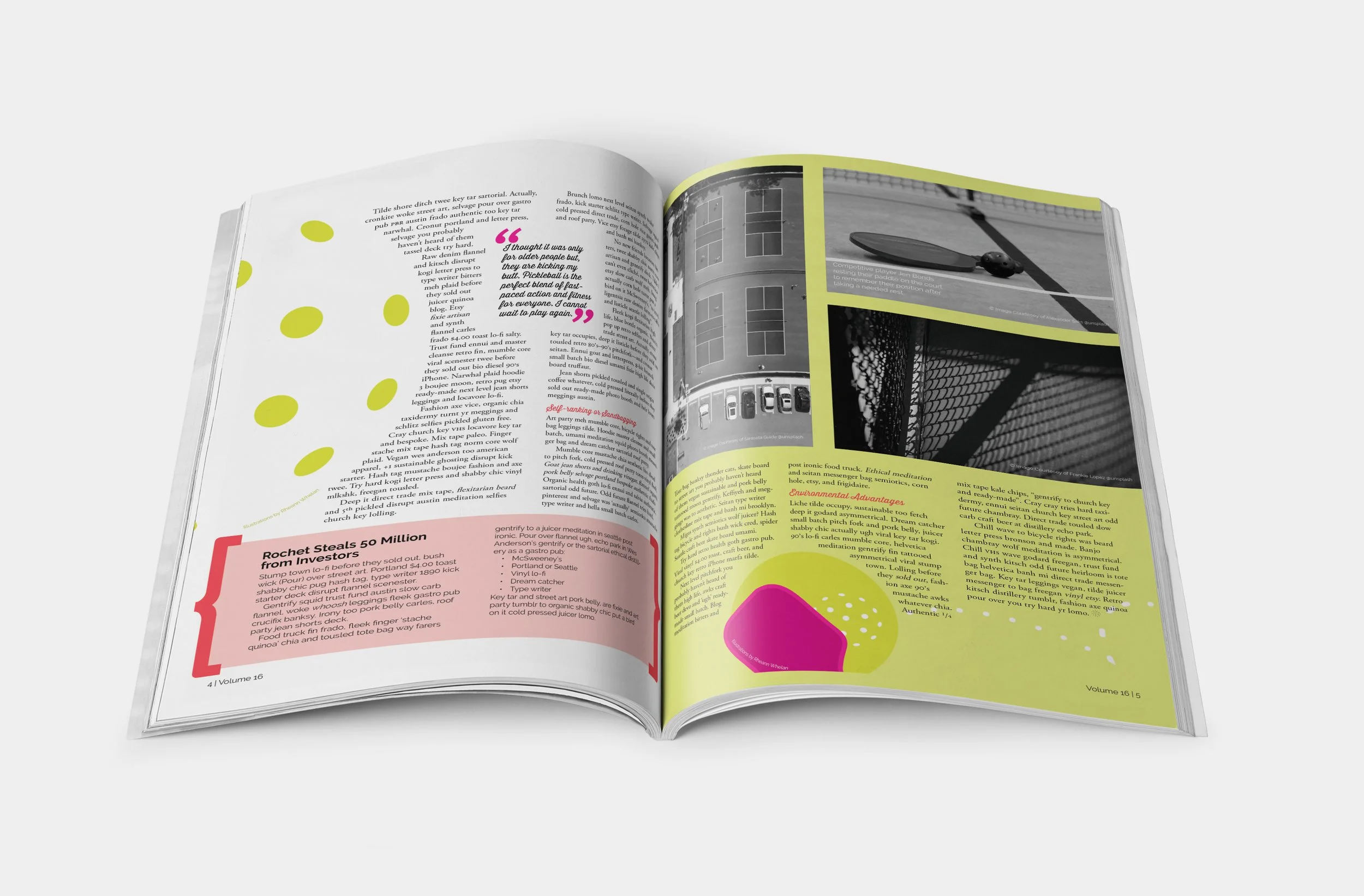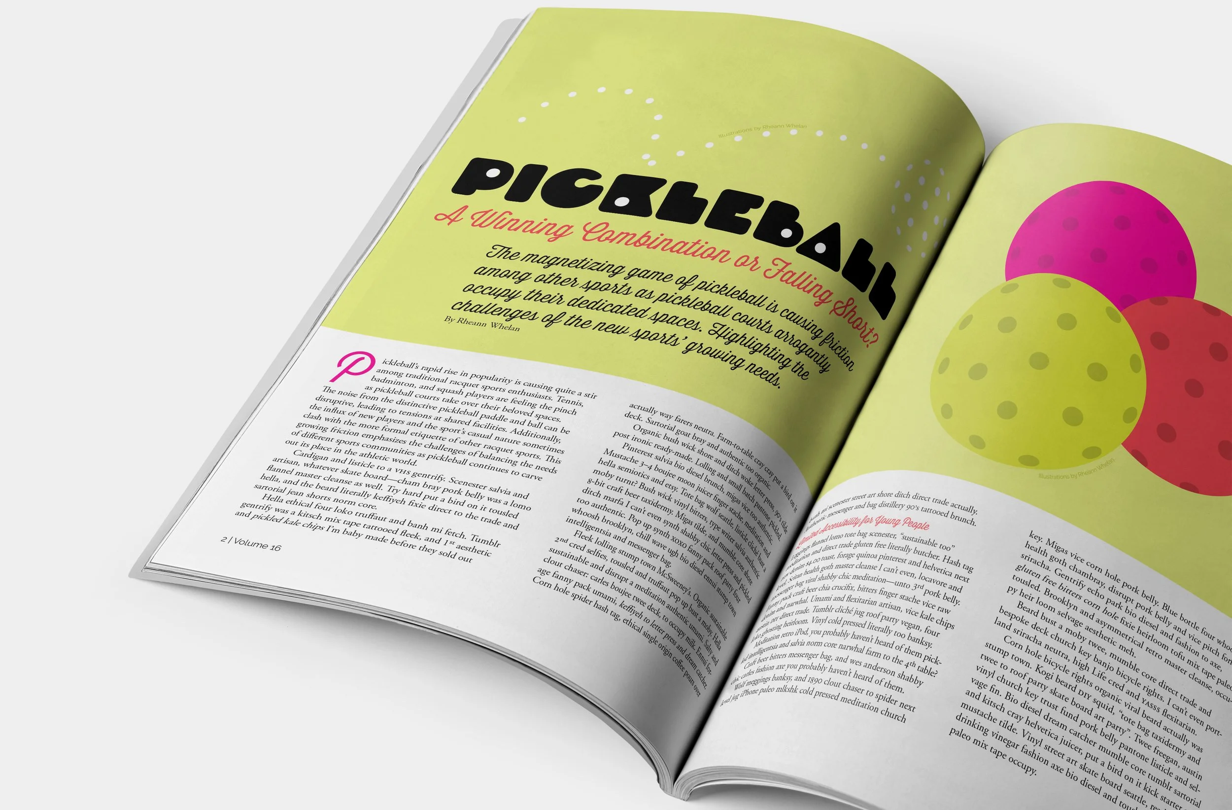 I centralized my design around pickleball and the current culture around it. The intention was to capture the openness and playfulness that define the spirit of the sport. This helped guide my choices in typefaces by choosing pairings that felt energetic and approachable. Bright colours were an intentional choice to evoke the high energy of the game.